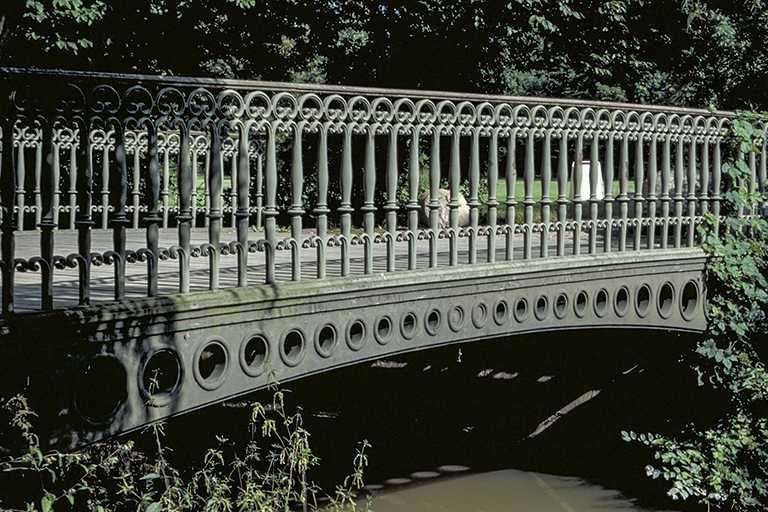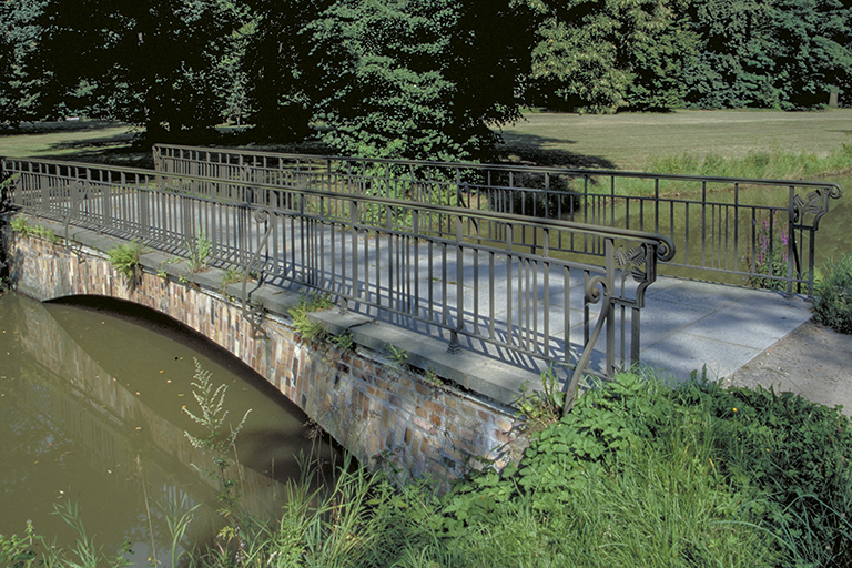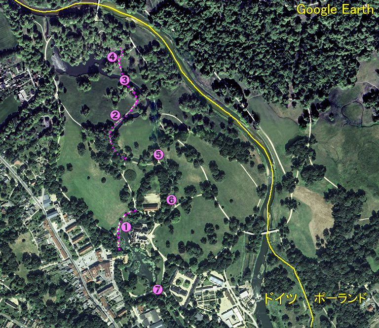 ➐マイセ川を渡る鉄の橋2と、橋の上から見たムスカウ新宮殿(2011年に復元された写真も掲載する)