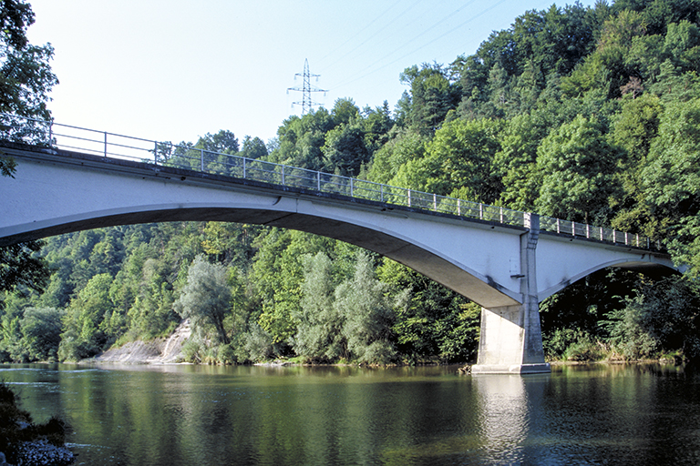 ローベル・マイヤールが2つ目に架けた「ツーオツのイン川橋」タイプの3スパン、箱桁のRC橋。1スパンでなく2スパンになっているところが違うだけの、田舎道の橋。ツーオツのイン川橋のところで述べた「箱桁端部の縦の亀裂」が入った後だったが、構造上の危険性はないと判断されたので、形式はそのまま踏襲された。1・2枚目の写真は橋の両側を撮ったもの。3枚目は橋の下から、4枚目の写真は中央の橋脚を撮ったもの。
