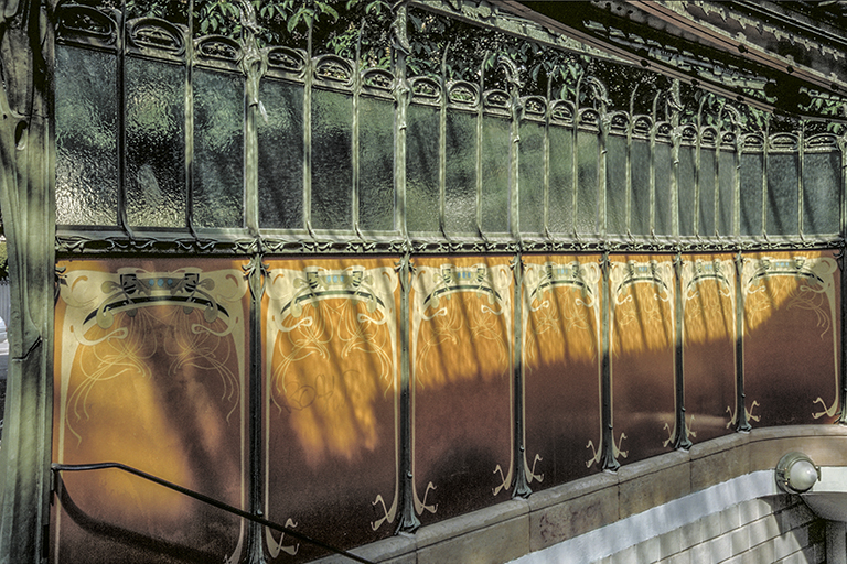 (1902年)。エクトル・ギマール(Hector Guimard)が、1900~13年の間パリ・メトロポリタン鉄道会社のメトロ入口の第一世代を担当した際、メトロの入口は5種類作られた。一番立派なのは、エトワール(Étoile)駅入口(1900年)とバスティーユ(Bastille)駅入口(1905年)。2つとも市民に気に入られることなく、無関心かつ当然のように取り壊されてしまった。それは、この奇妙なデザインが、一流の(新古典やネオ・ルネサンスに傾倒して創造力に欠けた)建築家からは軽蔑され、一般大衆からも好まれなかったから。ギマールのメトロ入口で2番目に立派なのが、このドーフィーヌ門駅入口。パリ中捜してもこれ一つしか残っていない。曲がった鋳鉄と波板ガラスを用いたアール・ヌーヴォーのデザインと、彼がデザインした「METROPOLITAIN」の字の組み合わせが生みだした「メトロ様式」だ。ドーフィーヌ門駅入口は、それに加えて壁面がオレンジ色で彩色され、「ベランジュ館」のところで紹介したブリュッセルのタッセル・ホテルの階段を思わせる繊細な模様で飾られている。まさに、芸術品と言える出来栄えで、パリで最も美しいアール・ヌーヴォーのメトロ入口だが、場所が悪くて人通りはほとんどない。最初に紹介するのが、既に壊されてなくなったバスティーユ駅の入口の古写真。2枚目の写真は、普通に斜め横から撮ったもの。3枚目の写真は、正面から撮ったもの。4枚目は、オレンジ色の壁面の拡大。