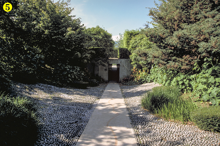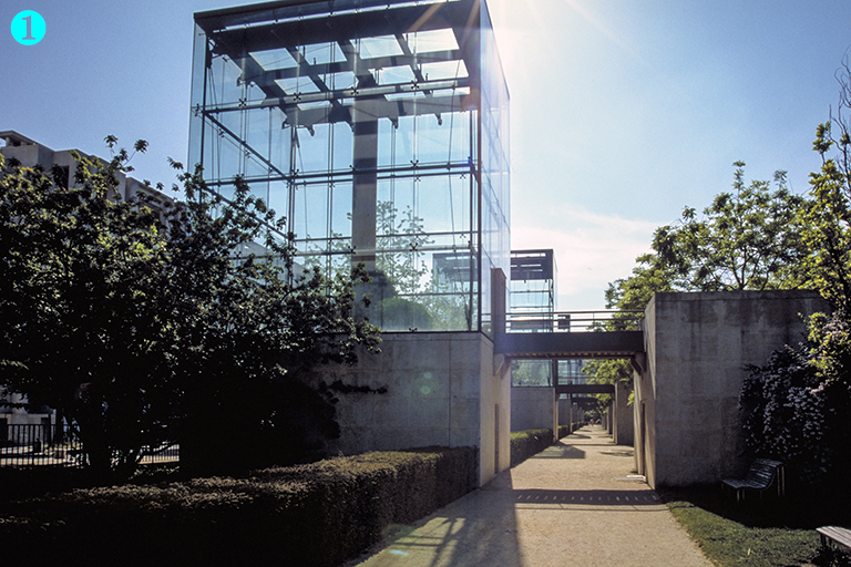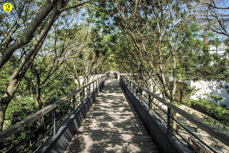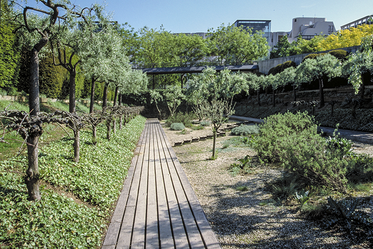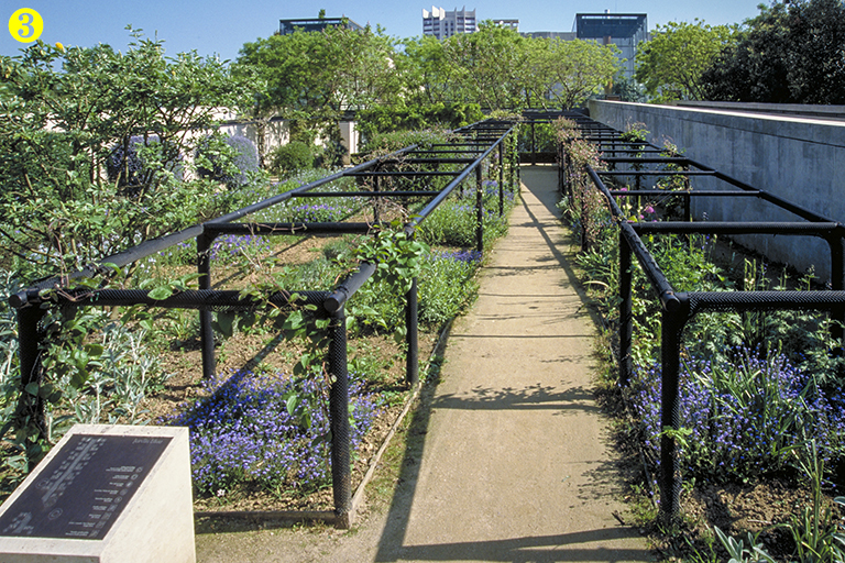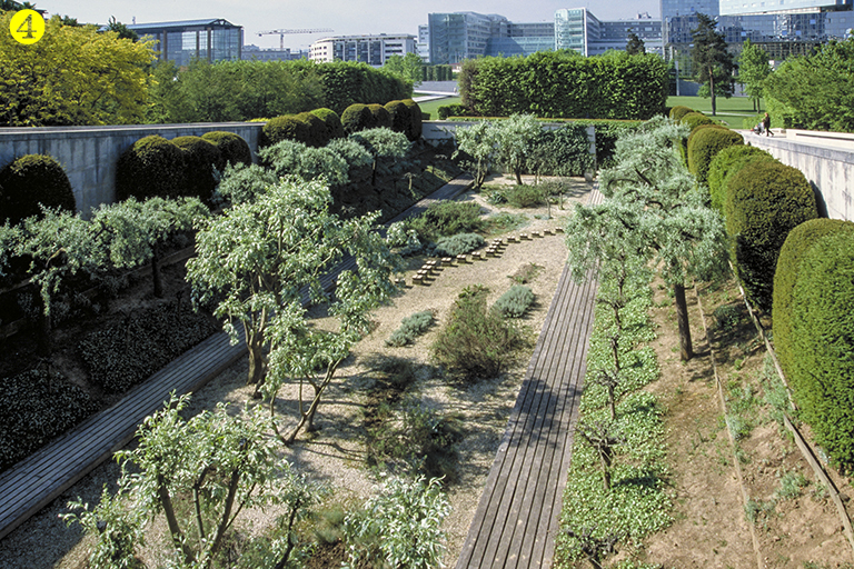 “日陰の植物の家” の東側から、この公園の真髄が始まる。東(地図の真上)に向かう通路が2本、“地表の通路” と “歩道橋の通路” が並行して約130mにわたって続く。“地表の通路” の左側には、寒さに弱い木を1~2本ずつ入れた “巨大な温室箱” が6つ並んでいる(1枚目の写真、❶)。その温室の一つを、“歩道橋の通路” から撮ったものが2枚目の写真。温室に入るには、“歩道橋の通路” から、簡単な木の橋で、“地表の通路” の上を渡る。3枚目の写真は、“歩道橋の通路” 歩道橋の通路の写真(❷)。両側から木の枝が通路を覆っているので、夏でも木陰にいるようで気持ちがいい。この歩道橋、橋桁だけは鋼鉄だか、歩く部分は木の板が並べてあり、その下は一定間隔で細い鉄の棒が支えているだけ(自然の材料に徹底的にこだわっている)。現地では、そこまで気付かなかったので、グーグル・ストリートビューの写真を4枚目に示す。そして、この歩道橋の通路の南側に6つの庭園が並んでいる。セーヌ川に近い西側から、“青の庭”、“緑の庭”、“橙の庭”、“赤の庭”、“銀の庭”、“金の庭” という名が付いている。これらの中で一番素敵だったのは2つ。“青の庭”(5・6枚目の写真、❸)と、“銀の庭”(7・8枚目の写真、❹)。“青の庭” では、青系の花が咲き揃い、“銀の庭” では、季節により葉が銀色っぽくなる樹種を選んで植えてある。“橙の庭”(9枚目の写真、❺)は、オレンジ色の花が咲いる木と草花が少しあったが、地面の半分以上が小石で覆われ暗い感じがしたし、“緑の庭” には木が密集していただけ。赤と金は全く冴えなかった。