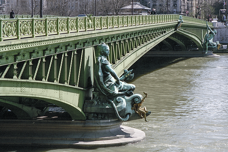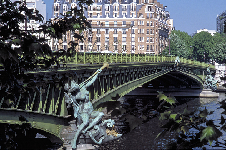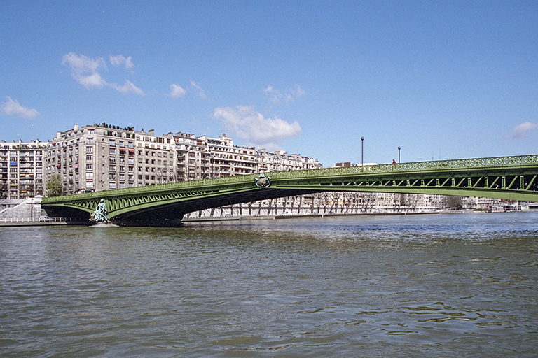 ミラボー橋は、1893~96年にポール・ラベル(Paul Rabel)の設計で作られた上路の鋼アーチ橋。長さ173mで3スパン、中央のアーチのスパンは93m。技術的な特徴としては、橋脚の基礎工に、現在では定番のニューマチックケーソン工法(地下に埋めるケーソンの下部に作業室を設け、圧縮空気を送り込んで地下水の浸入を防ぐ工法)をフランスで初めて採用した点。デザイン的には、典型的なネオ・バロック。著名な彫刻家ジャン・アントワーヌ・アンジャルベール(Jean Antoine Injalbert)が制作した4つのブロンズ像、「豊穣」(L’Abondance、上流側の左岸側橋脚)、「水運」(La Navigation、同右岸側橋脚)、「パリ市」(La Ville de Paris、下流側の左岸側橋脚)、「通商」(Le Commerce、右岸側橋脚)が置かれている。普通、ネオ・バロックの橋の彫刻といえば石像で、表現はもっと静的なので、これほど大きく、華やかで、目立つブロンズ製の像が置かれることは珍しい。なお、右岸側の銘板には、ギヨーム・アポリネール(Guillaume Apollinaire)が1913年に “ミラボー橋” の詩を詠んだのを受けて、最初の1節が刻まれている。「ミラボー橋の下をセーヌが流れ、私たちの愛は忘れてはならない。悲しみの後にはいつも喜びが訪れ、そして夜の帳が下りる。日々は過ぎ去り、私は留まる(Sous le pont Mirabeau coule la Seine et nos amours faut-il qu'il m'en souvienne. La joie venait toujours après la peine vienne la nuit sonne l’heure. Les jours s’en vont je demeure.)。1枚目の写真は、左岸下流側から撮ったもの。こうして見ると、後の2枚と違って非常にフラットな橋に見える。2枚目の写真は、右岸下流側から、ブロンズ像を主に撮ったもの。近くから撮っているので、橋はアーチではなく三角形のように見える。3枚目の写真は、左岸上流側から、これもブロンズ像を主に撮ったもの。なお、この写真を撮ったすぐ横に、ジャヴィル駅がある。