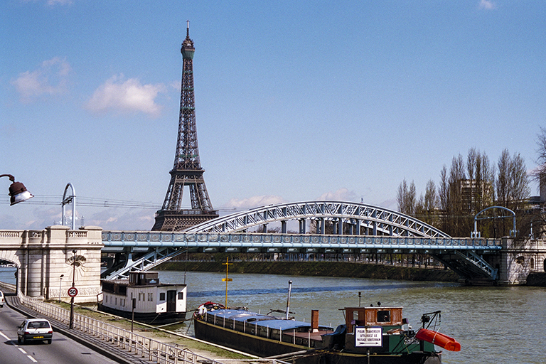 は、ナポレオン3世の治世中に建設されたパリを周回するプティット・サンテュール(Petite ceinture)鉄道のドゥーテイユ高架橋(Viaduc d’Auteuil、1863年)が、1900年のパリ万博の会場へのアクセスに不便だったことから作られた。この鉄道橋は、セーヌ川の中央に作られた長さ890m、幅11mの人工島、シグネ島(Île aux Cygnes、右岸側と左岸側の流れを均等化するために1825年に作られた)を斜めに横切っている。橋の見どころは右岸側のスパン85.7mの中路の鋼アーチ橋。設計は建築家のボネ(A. Bonnet)。鋼アーチ部はごく普通の橋。しかし、どこにも書かれてないが、①石の橋台(曲面欄干、中央の大きな曲面の欄干の台石とその中心に設けられた円から放射線状に描かれた線、最下部の多数の人の列を思わせる飾り)、②曲線を描く架線柱と、柱の取り付け部の円と半円で構成された補強材、③高欄の円と逆半円を重ねた連続飾りは、アール・ヌーヴォー的な試みを強く感じさせる。1枚目の写真は、エッフェル塔を含めた全景、2枚目の写真は、アーチ橋の全体像、3枚目の写真は、上記①の橋台、4枚目の写真は、上記②と③の架線柱と高欄。なお、シグネ島の下流の先端(ルーエル鉄道橋から350mほど下流)に、自由の女神像が建っている(5枚目の写真)。フランス政府は、1876年、アメリカ建国100周年を祝して自由の女神像(高さ45.5m)をニューヨーク市に贈ったが、その返礼として、パリのアメリカ人委員会が、フランス革命100周年を記念して1889年にパリに寄贈した像(高さ11.5m)。この像は、1998~99年に「日本におけるフランス年」を記念して東京のお台場に貸し出され、その後、ここに戻された。お台場には1999~2000年にクーベルタン鋳造工房で制作されたレプリカが2000年末に再設置された。