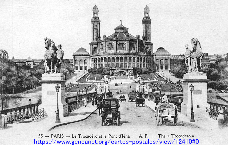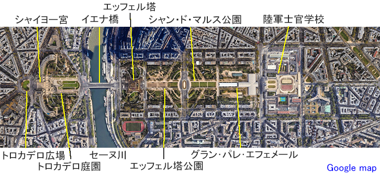 は、極めて数奇な運命を辿った橋。1806年のイエナの戦いでプロイセンに勝利したナポレオンが、1807年に陸軍士官学校(École militaire)から見下ろせる橋の建設を命じたのがスタート。彼は、完成した橋に、プロイセンに勝利した記念に「皇帝の鷲」を刻むことが夢だった。橋は1808に着工、1814年に完成したが、彼が退位させられたのは1814年の4月4日。どこを見ても、何月に完成したか書いてないが、完成した時点で「皇帝の鷲」が橋脚の上に付いていたことは確か。ナポレオンは、1815年にエルバ島を脱出し、パリに戻って復位し「百日天下」の末、セントヘレナに幽閉された。ルイ18世は、イエナ橋を陸軍士官学校橋と改名し、「皇帝の鷲」を取り除き、代わりに、ルイ(Louis)の “L” の字を付けた。1852年にナポレオン3世が第二帝政の王位に就くと、橋の名はイエナ橋に戻り、新しい「皇帝の鷲」がジャン・フランソワ・ムレ(Jean-François Mouret)によって作られ、再び橋を飾る。その後、1900年のパリ万博の期間中、イエナ橋は、エッフェル塔の真正面にあることから、博覧会の中核的な橋となり、両脇に金属製の歩道橋が追加され、橋の幅は14mから19mになった(1枚目の絵葉書参照)。さらに、1937年のパリ万博では、コンコルド橋のように、橋の両側から石橋脚が付け加えられ、橋の幅は35.8mになった(2枚目の写真)。3枚目の図は、グーグル・マップで、橋の周辺の状況を示したもの。陸軍士官学校は橋からちょうど1km離れている。1枚目の絵葉書は、1887年に出来たエッフェル塔側から、橋の向こうのトロカデロ会場を撮ったもので、イエナ橋が如何に重要な場所にあったかが良く分かる。2枚目の絵葉書では、シャイヨー宮が右端に写っているが、宮殿は1937年のパリ万博の中心パビリオンだった。イエナ橋は 常に万博と一緒にいる。