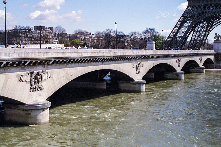 1枚目の写真は、少し離れた場所からイエナ橋を撮ったもの。コンコルド橋と同じ、ペロネ式の「半円アーチの上部だけを切り取った扁平なアーチ」が使われていて、ライズ比(高さ/スパン)は約0.12と、コンコルドの0.13より一段と扁平になっているが、橋脚の幅はスパンの約1/8で、コンコルドの1/10.6に負けている。2枚目の写真は、エッフェル塔の下部を入れて、近くから橋を撮ったもの。拡幅部分が、独立した橋脚になっていることが分かる。3枚目の写真は、ナポレオンがこだわった「皇帝の鷲」の彫刻。なお、ユネスコの世界遺産「パリのセーヌ河岸」について、ユネスコのサイトには、「サン・ルイ島の東端にかかるシュリー橋から、左岸にエッフェル塔をのぞむイエナ橋までが、世界遺産に登録されている」と書かれている。しかし、個別の橋を見ると、アレクサンドル3世橋、コンコルド橋、ポン・デ・ザール、ポン=ヌフの名前はあがっていても、イエナ橋そのものが世界遺産だと明確に書いた資料を見つけることができなかった。そこで、上のユエスコの文章は、単に「パリのセーヌ河岸」の範囲を示すもので、その中に入るすべてが遺産になる訳ではないので、イエナ橋は除外して表示する。間違っていると分かった段階で表示を改める。