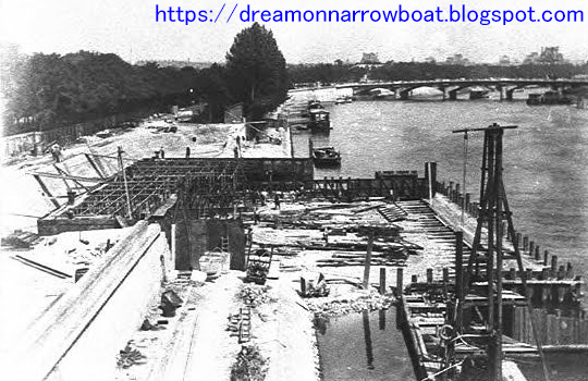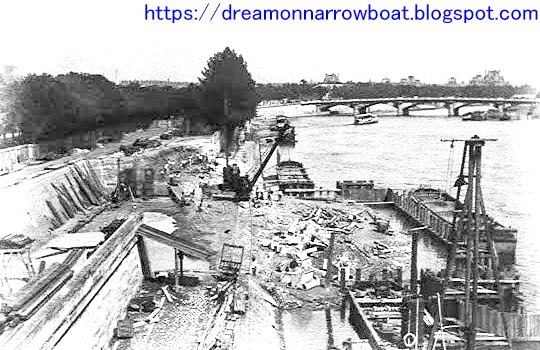 は、1891年に皇帝アレクサンドル3世とフランス共和国大統領サディ・カルノーの間で締結された露仏同盟の象徴的存在(橋の名前も、そこから来ている)。そして、1900年のパリ万博の象徴でもあった。橋は、アンヴァリッドの正面に架けられ(といっても、約650mも離れてはいるが)、反対側には、万博の会場として建てられたグラン・パレ(Grand Palais)とプチ・パレ(Petit Palais)が、橋から北に伸びるアレクサンドル3世大通り(現在のウィンストン・チャーチル大通り)の左右に建っている(橋から入口まで約170m)。橋には大きな制約が課せられた。それは、会場側から橋の向こうのアンヴァリッドが完全に見えないといけない、つまり完全に水平でなくてはならないということ。それに、航行のさらなる邪魔にならないよう、途中に橋脚は設けないようにするため、フラットに近い単スパンのアーチ橋が要求された。それに応えたのが、19世紀末のフランスで、金属橋の最も偉大な設計者と言われたジャン・レザル(Jean Résal)。彼が考案したのは、スパン107.5mの鋳鉄アーチ橋。ライズ比(高さ/スパン)は僅か0.059(コンコルド橋を作ったペロネの他の最高作で0.09、以前にも引用した「日本一扁平」とされる長野県の鋼アーチ橋でも0.09)。これほど扁平だと、膨大な水平方向の推力が発生するので、両岸はよほど頑丈に作らないといけない。https://dreamonnarrowboat.blogspot.com/2018/05/la-construction-du-pont-alexandre-iii.html というサイトに、かつて橋梁道路学校(École des ponts et chaussées)が収録した写真が掲載されていたので、それを、まず3枚連続して掲載する。1枚目は工事に着手してから最初の写真(1897年5月28日)。2枚目は台(plateforme)の建設が始まったところ(6月11日)。3枚目は完成した台(7月4日)。台の構造は、https://www.worldfairs.info/forum/viewtopic.php?t=606-pont-alexandre-iii というサイトに載っている(4枚目の図)。そして、再び前のサイトに戻り、5枚目では、台の上にケーソンの列が立っている(8月3日)。これに対応した図が6枚目にある。これは、作業員が上部のケーソン(気閘)から中に入り、圧縮空気の中を底まで降りて行き、底から順次コンクリートを詰めていく装置。ケーソンの場所を上げて行くことで、巨大なコンクリートの立方体が作られた。図の下の7枚の写真は、完成した大きな台の上に、橋を架けるための巨大な作業用のトラスがセーヌ川の上に張り出していく様子(1898年8月20日)。このトラスは最終的に対岸まで達し、その下に、木製のアーチ形の台が作られ、工場から運ばれてきた鉄のアーチ部材が組み立てられて行く(8枚目の少し大きな写真)。この時期の工事の全景が9枚目。建築家のジョセフ・カシアン・ベルナール(Joseph Cassien-Bernard)が設計した巨大な柱の建設も、橋の両端・両側の4ヶ所で進められている。最後の10枚目は、完成後の写真。実に扁平だとよく分かる。