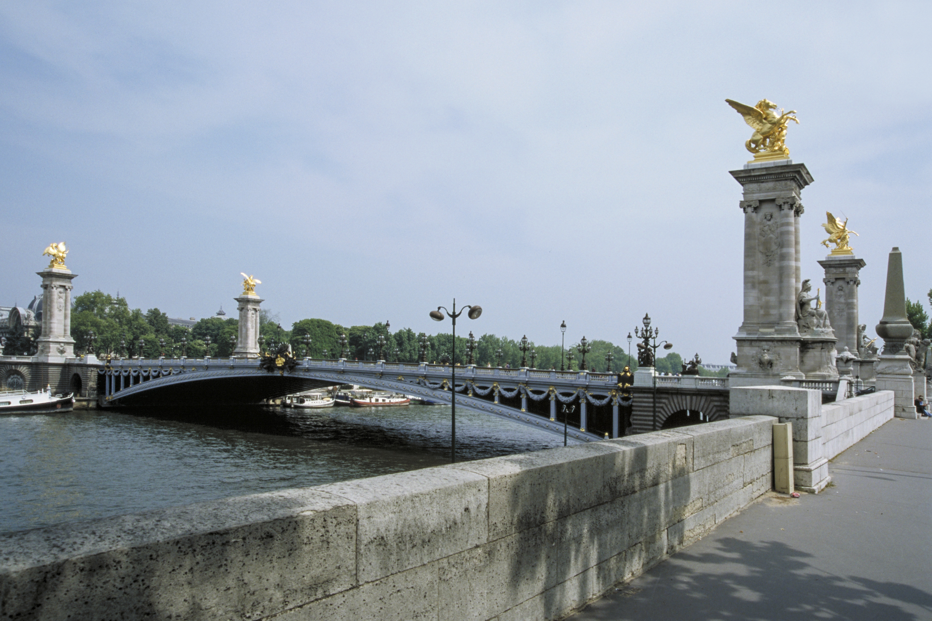 ここからは、私が撮った写真。橋は何度か色が変わり、最近では、灰色→緑がかった茶色→元の色彩と推移した。1枚目の写真は、上流側左岸から撮った “緑がかった茶色の時代” の橋。2枚目の写真は、1枚目とほぼ同じ角度から撮った、元の色彩の橋。この方がよく似合う。背後に写っているのは、グラン・パレの屋根。3枚目の写真は、下流側左岸から、少し離れて撮った全景。4枚目の写真は、橋の装飾が分かるように撮ったもの。
