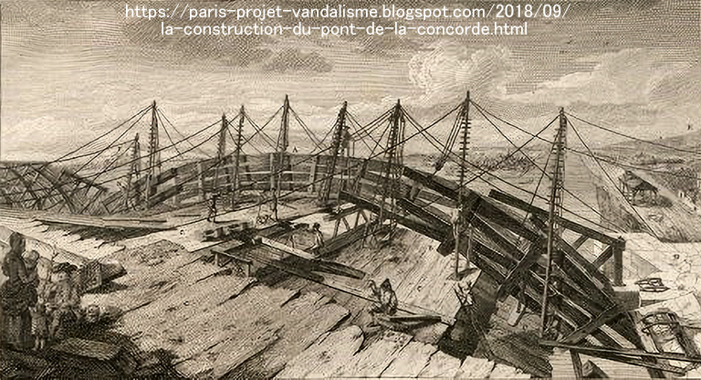 そして、「迫石」を、中央の「楔石」を除いて並び終えると、5つあるアーチの頂点の空隙に、5ヶ所同時に「楔石」を挿入する。すると、バラバラだった5つのアーチは一つの連続アーチとして強い力を持った構造物に変身する。あとは、アーチの隅の隙間を壁石で塞ぎ、橋の上部を水平にすれば工事は完了する。ここで、もう一度、コンコルド橋そのものに話を戻そう。コンコルド橋が着工された翌年には、フランス革命が起きたので、橋の建設には革命で破壊されたバスティーユ要塞の石が使用された(こうした残虐な行為を二度と起こさないという戒めのため)。18 世紀末には新古典主義が流行していたので、ペロネは作品に列柱のような外観を与えたいと考え、橋脚の先端を半円柱にし、アーチの部分と連続するようにコーニス(帯状の石)を置き、その上にデンティル(歯状装飾)付きの高欄を乗せた。なお、最初にペロネが作った時は、橋の幅は14mで十分だったが、車時代に入り、それでは狭すぎたので、1930年に技術者のデヴァル とマレによって幅30mに拡幅された。その時の方法は、橋の両側の装飾的な高欄~橋脚を取り外し、橋の両側に新たな橋脚を作り、その上にもう一度装飾的な高欄~橋脚を再設置するという手法が取られた。1枚目の写真は、コンコルド広場を入れたコンコルド橋。2枚目の写真は、できるだけ扁平なアーチを感じさせるように離れて撮ったもの。2枚目の写真の橋の下を見ると、1930年に各幅した時に両側に追加された橋脚がよく見える(追加部分の橋脚は、ペロネの橋脚と離して設けられたので、短、長、短と3つ見える)。私は正面からの写真が欲しかったが、セーヌ川を船で観光したことはないので、パリの橋の専門サイトにあった正面からの写真(扁平なことが良く分かる)を3枚目に掲載する。