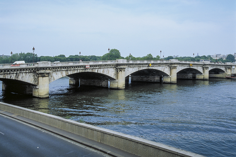 【世界遺産】コンコルド橋(1788~91年)は、18世紀後半のフランスで石アーチ橋の設計概念に革命的な変化をもたらしたジャン=ロドルフ・ペロネ(Jean-Rodolphe Perronet、1708~94年)の代表作。ペロネは、橋梁道路学校(École des ponts et chaussées)の創設者であり初代校長で、橋梁技術(美術を含む)を教える場を作っただけでなく、自ら10以上の橋を架けた。その中で、①パリの中心という場所と、②5スパンで全長155mという規模、③第一次世界大戦で爆発されたサントゥ=マグザンス橋(Pont-Sainte-Maxence、1774~85年、1枚目の写真)に次いで扁平なアーチという点で、コンコルド橋はペロネの最高傑作と言える。