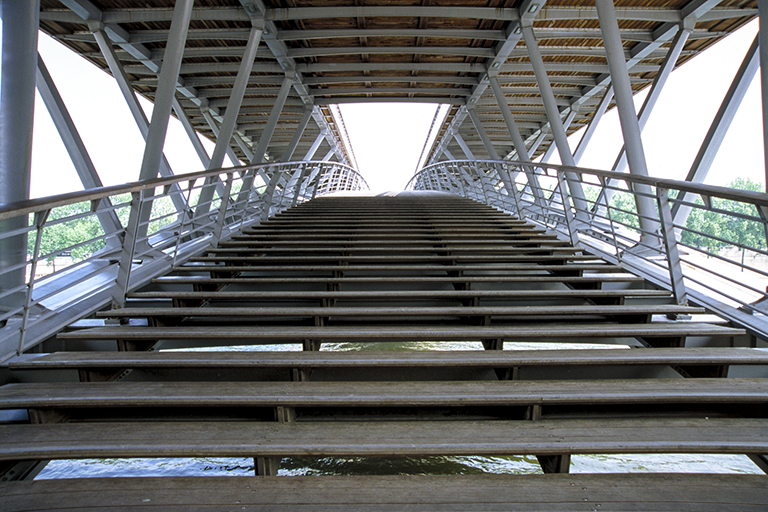 この橋は、最初ソルフェリーノ歩道橋と名付けられ、その後、2006年にレオポール・セダール・サンゴール橋(Passerelle Léopold-Sédar-Senghor)と名称変更された。私が行った時はソルフェリーノだったので、ソルフェリーノ歩道橋のままにしておく。【なぜかというと、改名にフランスの悪しき独善性を感じるから。1906年にフランスの植民地セネガルで生まれたサンゴールは、若い頃から「フランス人になりたいという願望」を持っていた。サンゴールは国際バカロレア資格を取得すると、「植民地の黒人エリート」として、1928年にパリに行き、1933年にフランス国籍を取得、古い歴史を持つ公立の後期中等教育機関リセ・ルイ=ル=グラン(LBG)で教育を受け、1937年からは詩や記事を雑誌に掲載するようになる。サンゴールの基本的姿勢は、植民地化自体は非難されるべきものではないというもの。そして、1945年に出版された『フランス帝国共同体(La Communauté impériale française)』という本の共著者の1人として、フランス連邦制の樹立が、アフリカで目覚めつつあるナショナリズムに対する唯一の防衛策だと主張した。反植民地主義運動の高まりに不安を抱いたフランスの雑誌や新聞は、「連邦主義は20世紀の真実であり、フランス連合の未来である」と述べるサンゴールに喝采を送った。サンゴールは1960年に独立したセネガルの初代大統領になる。ソルフェリーノ歩道橋を、サンゴールの名に変えたのは、サンゴールの生誕百年を祝したもの。フランス植民地擁護者への称賛でもある】。この歩道橋は、パリ市内のセーヌ川に架かる一番モダンな橋。建築家でエンジニアのマルク・モーリス・ミムラム(Marc Maurice Mimram)のデザインで、1997~99年に作られた。アレクサンドル3世橋と同じ単スパンの鋼アーチ橋だが、堤防上の河岸と、セーヌ川の遊歩道(Berges de Seine)の両方からアクセスができ、橋の中央付近で双方が合流し、その後は、対岸の河岸か遊歩道の好きな方に行くことができる。非常に面白い発想だが、構造の魔術師とも言われるスペインのサンティアゴ・カラトラバや、イギリスのウィルキンソン・エア建築事務所の作品と比べると、きわめて地味。しかし、パリの中心で橋ばかり目立っても無様(ぶざま)なので、近くの他の鉄のアーチとも似たこの橋のデザインは、少し重苦しいが、正解だったと言えなくはない。1枚目の写真は左岸下流側から撮った全景。2枚目の写真は遊歩道からの入口。3枚目の写真は少し階段を上がった所。歩く部分は、ポン=デ=ザールと同じボンゴシ材が使われている。4枚目の写真は、橋の上にある、“河岸に行く上路と遊歩道に降りて行く下路の分岐点” から撮ったもの。