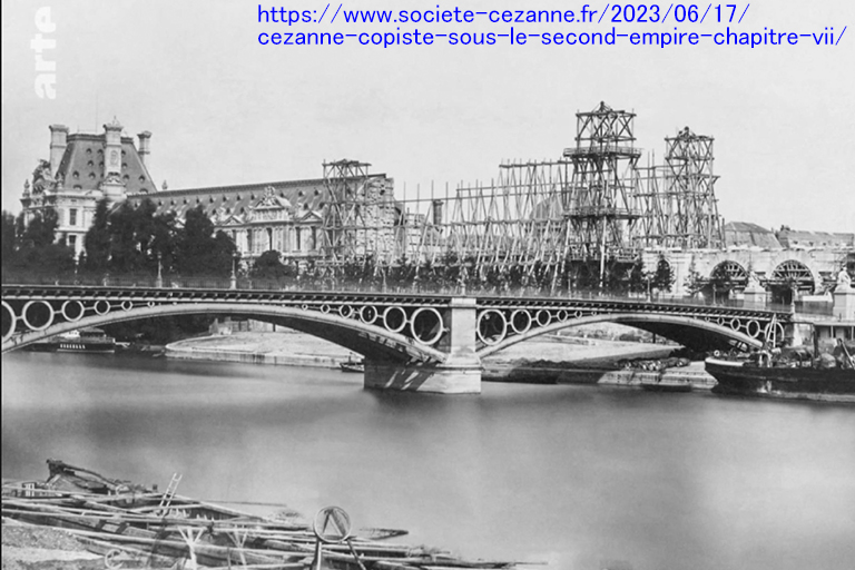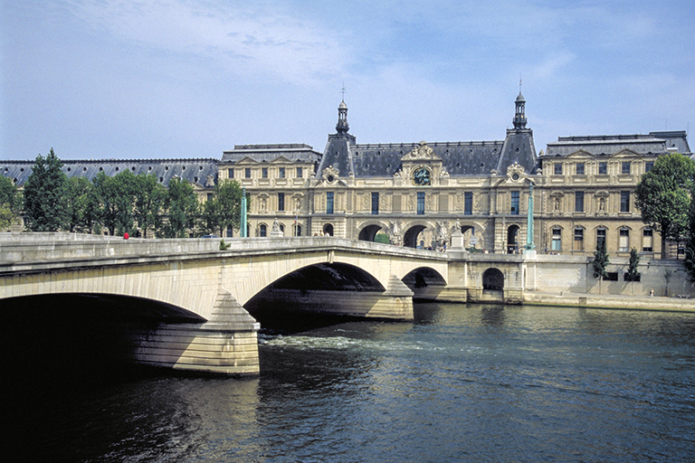 現在のカルーゼル橋は、1935~39年に架け替えられた長さ168m、3スパン(47.67m)のRCアーチ橋。ロワイヤル橋の240m上流に位置するので、スパン数こそ5から3に減らして航行に配慮したが、外観を重視し、コンクリートの上にはすべて石を張り、デザインもロワイヤル橋と同じ簡素なデザインとし、三角の橋脚の三角屋根の段差まで同じ形にして統一感にこだわった。ただ、アーチはバスケットハンドル・アーチではなく、コンコルド橋と同じ “半円アーチの上部だけを切り取った扁平なアーチ” だが、どこにも高さが書いてないので、ライズ比がどのくらい小さいのかは不明。残念なのは、建築家が4体の大きな像を橋の両端の左右に置いたこと。幸い、あまり目立たないので、ロワイヤル橋の概念は崩れていない。1枚目の写真は、https://paris1900.lartnouveau.com/ponts/ のサイトにある正面からの写真(奥に見えるロワイヤル橋の橋脚と対比できる)。2枚目の写真は、ルーブル美術館のラ・トレモワイユ・パビリオン(Pavillon de la trémoille)の正面にあるカルーゼル橋を左岸上流側から撮ったもの。3枚目の写真は、逆に、右岸上流側から橋をメインに撮ったもの。