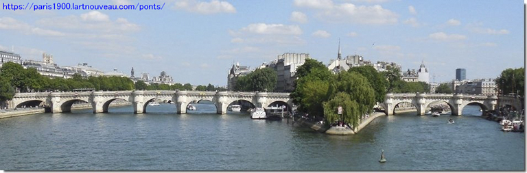 【世界遺産】ポン=ヌフは、1578~1607年にかけて作られた現存するパリ最古の橋。ここで、パリの橋の歴史を少し見て行こう。17世紀までパリの中心はシテ島で、そこには木橋が9世紀から架けられていた。パリ最古の石アーチ橋は、1280年の洪水の後に、シテ島の北側に架けられた「大きな橋」(Grand-Pont)。14世紀には、島内の両替商が集まる場所に「両替商の橋」(Pont-aux-Changeurs)が架けられ、1621年の火災の後、1647年にNo.45のシャンジュ橋(Pont au Change)として再建された。No.46のサン=ミシェル橋は、1379~87年に石アーチ橋として架けられ、1408年の洪水で流された後は木造で再建され、石アーチに戻されたのは1623年でポン=ヌフ以降。No.47のノートル=ダム橋は、木造橋が崩壊した後、1501~12年にかけて石アーチ橋として再建された。ポン=ヌフが完成した時点では、リストに入っていない「小橋」(Le Petit-Pont)を含め、既に4つの石アーチ橋が架かっていたので、その時点でポン=ヌフは5番目の石アーチ橋。下の絵は1600年のシテ島を描いた絵。工事中のポン=ヌフを含めて5つの橋が描かれている。ならば、なぜポン=ヌフは、「新しい橋」という名が付いたのか? ①それまでの橋は、シテ島とセーヌ川の対岸を結ぶだけで、セーヌ川の左岸と右岸を直結する橋は、ポン=ヌフが初めてだった。②それまでの橋が、歩行者と馬、家畜の牽く荷車が混在して橋を渡っていたが、ポン=ヌフで初めて歩道が設けられた。③そして、何よりも、それまでの橋は、橋の上に4階建て(フランス式に言えば3階建て)の家が並んでいたが、ポン=ヌフには家がなかった。「最初」が3つも重なったことから、場所や関係者の名前ではなく、「新しい橋」という名前が付けられた。ポン=ヌフの高欄のモールディングの下には、マスカロン(mascaron、仮面飾り、ポン=ヌフでは古代神話の森と野の神々)を使った持ち送り(381個)が付いているが、その理由として、❶住民を悪霊から守るため、❷幸運と成功への祈願、と二通りの解釈が書いてあったが、マスカロンの顔の醜さから推定すると、❶のような気がする。