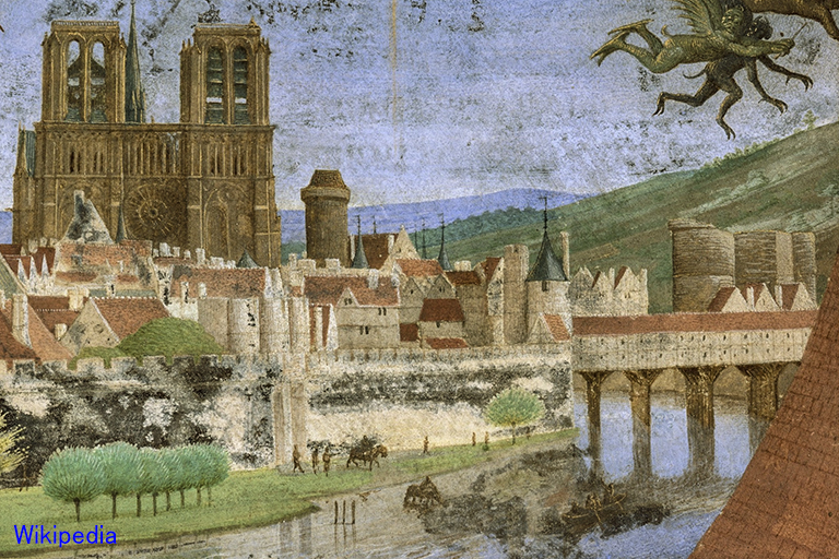 は、シテ島と南側(セーヌ川の左岸)を結ぶ橋。1379~87年に石造橋が作られ、シテ島とセーヌ川の両岸がつながった。1407~08年の冬に セーヌ川の巨大な氷塊で崩壊し、1408年 すぐ木製で再建された。1枚目のカラフルな細密画は1452~60年頃に描かれたもの(絵の一部)。この橋も1547年の洪水で破壊されたが、同年中に木造で再建。1616~23年には石アーチ橋に架け替えられ、当時の習わしで橋の上には家が並んだが、1786年の王令で撤去され、2枚目の古写真(1857年に撮影)のようになった(橋台上の装飾は、同時期に作られて現存しているマリー橋と同じ)。現在の橋は、オスマンの計画に従い、北のシャンジュ橋とほぼ同時に架け替えられた(1857年)。長さ62m、スパン17mのバスケットハンドル・アーチ3個の石アーチ橋で、外観もシャンジュ橋そっくり(3枚目の写真)。