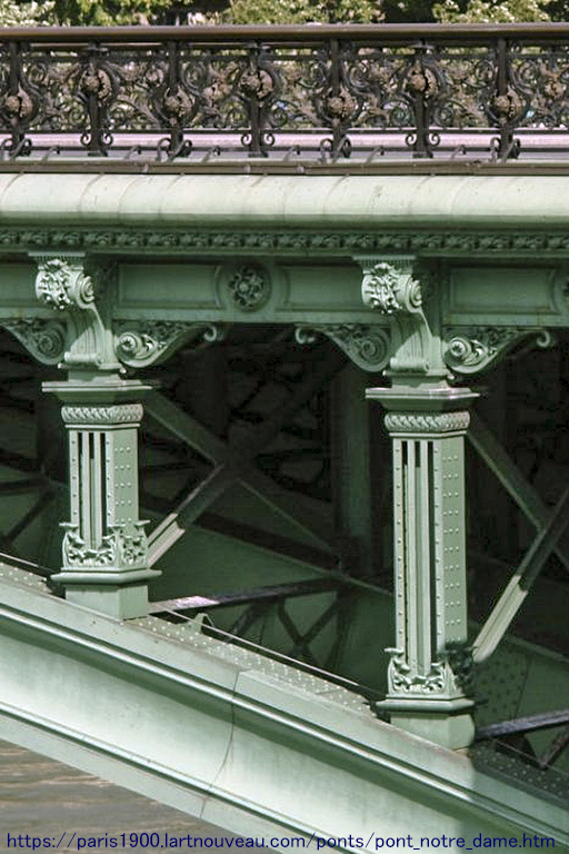 この1853年の新橋の失敗は、1512年の旧橋の基礎をそのまま使ったこと。その上に建てられた橋脚は、その時点でのセーヌ川の流れと一致しなかったため、何度も船がぶつかる事故が起きた。そこで、5スパンあるアーチのうち、両端の2つを残し、真ん中の3つを壊し、代わりにスパン59.5mの鋼アーチを架けることが決まり、アレクサンドル3世橋を手掛けた超一流の橋梁技術者ジャン・レザル(Jean Résal)が設計を担当した(完成は1912年)。形式は普通の上路の開腹アーチ橋だが、アーチと桁をつなぐ垂直材の上下と、高欄に鋳鉄を使ったきめ細かな装飾が施され、アレクサンドル3世橋に負けず劣らずといった感じの出来栄え。1枚目の写真は、1853年の石アーチと1912年の鋼アーチの両方を撮ったもの。2枚目の写真は、鋼アーチのみを撮ったもの。3枚目の写真は、https://paris1900.lartnouveau.com/ponts/ のサイトから、繊細な装飾のクローズアップ写真を掲載したもの。