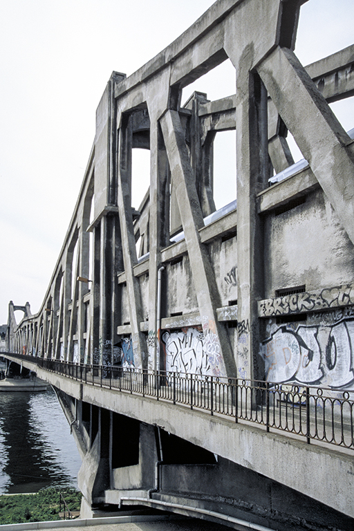 は、送電用の電気ケーブルを通す目的で設計された。1926年、この計画は、パリのメトロポリタン鉄道会社、パリ配電会社(CPDE)、パリ電気会社、セーヌ電気会社(現・イヴリー発電所)、ユニオン電気会社という5つの大企業の取締役によって提案された。彼らは、自己負担で橋を建設し、それを県に譲渡し、使用権のみを保持することを望んだ。セーヌ県はコンペを開催し、圧倒的に安値で落札したソシエテ・ジェネラル会社(Société générale d’entreprises、現在のSGE、世界第2位の建設会社)は、シャルロ(Charlot)の設計による鉄筋コンクリート製のカンチレバートラス橋という前代未聞で、以後も他に例のない構造形式で作られた。橋の上層部には2階建てのパイプライン用の箱が設けられ、下層の両端は歩道橋として一般に開放された。橋の長さは214m、中央スパンは134.6mもある。1枚目は正面から撮った写真と設計図を対比して示したもの。2枚目の写真は、右岸上流側から撮ったもの。3枚目の写真は、橋脚の部分を撮ったもので、2層になったボックスの上に、さらに、最初にはなかったパイプが通してある。歩道は、一番下の水平に桁が通っている部分で 落書きが一杯してある。4枚目の写真は、歩道の様子を撮ったもの。あまり広いようには見えない(これで自転車が通れる?)。