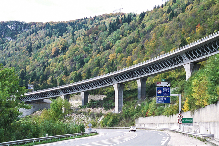 シラン高架橋は、最もフランスらしくて、技術的にも革新的な構造物。スイス国境に近い山の斜面に、逆三角断面のコンクリート製のダブルワーレントラス(工場生産)が並ぶ姿は斬新で、コンクリート橋発祥の地フランスならではのもの。デザイン担当のピエール・リシャール(Pierre Richard)と構造担当のボグミル・セラファン(Bogumil Serafin)の見事な合作。なぜ、トラスなのか? それは、このコンクリート橋が外ケーブルを使ったPC橋でもあるから。従来の埋め込み型のPCだと、内部のPCケーブルが腐食しても分からず崩壊の恐れがあるが、外ケーブルだとケーブルの腐食を常にチェックできる。日本では、中を空洞にしたコンクリート桁の中に外ケーブルを入れるが、シラン高架橋では、白いダブルワーレントラスで内部に黒いパイプに入った外ケーブル(それぞれのスパンごとに12本のケーブルが、桁の端部の上から下部の桁を斜張橋のように引っ張り上げている)を入れることで、見えにくくするというアイディアを採用した。お陰で、ケーブルの腐食は外から簡単に確認できるし、見た目も美しい。シラン高架橋は全長1268m(55m、60.6mが19連、59.8m)で1989年完成。逆三角断面と書いたのは、道路の通る上面全幅が10.75mであるのに対し、下面は3.80mしかなく、その間に斜めにトラスが入っているから。実はその1年前に同じA40用に作られたグラシエール高架橋(Viaduc des Glacières、長さ214m)も、同じ2人によって作られている。