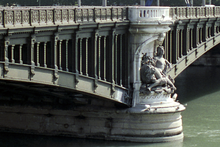 ラファイエット橋は、1890年に作られた鉄製の上路アーチ橋で、長さ185m、最大スパン72.5m、残りの2つのアーチはスパンがすべて異なる。橋の名は、三色旗の創始者でもあるラファイエット侯爵に由来する。この時代にしては、それほど優れた技術的価値はないが、目を奪われるのは、パリ以外では見られないようなネオ・バロックらしい装飾橋。橋脚上には上下流計4基の、ごくリアルで大きな白い大理石の彫刻が飾られている(作者はJean-Paul Tabey、オリジナルは美術館)。それだけでなく、鉄の大きなアーチで路面を支える鉄の柱の3本に1本の割合で、鋳鉄で作られた飾り柱が貼り付けられ、醜いリベットを隠している。1944年9月2日、撤退するドイツ軍により橋の中央のアーチが破壊されたが、1946年に修復された。1枚目の写真は、右岸側の上流からの全景。2枚目の写真は、彫刻と鋳鉄飾りを拡大したもの。