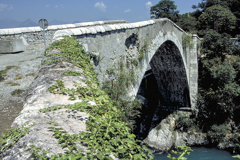 レディゲール橋は、クレー(Claix)の町の境界になっているドラック(Drac)川を跨ぐスパン45.65mの石アーチ橋。旧ドーフィネ州のレディゲール(François de Bonne de Lesdiguières)中将の指示により1611年に作られた。橋の名前も、中将の名前から来ている。19世紀後半、古くなった橋がドラッグ川の水面から約16m上に聳えていて通行に不便が生じたため、1873年に水平で低い橋が、レディゲール橋にぴったりくっつくように作られた。1枚目の写真を見ると、少しは距離があるように見えるが、実際にはほとんど隙間はない。それでも、新橋の設計者は扁平なアーチ部分にレディゲール橋と同じ白くて小さな石を張り付け、高欄の下には白い石を水平に並べ、下流側から見た時に一種の統一感を与えるだけの配慮はしたようだ。レディゲール橋は、1898年に歴史的建造物に指定されているが、写真から分かるように、維持管理が十分にされているとはとても思えない。2枚目の写真は、橋への登り口。3枚目の写真からは、橋の上の路面のひどさ、小石が乱雑に敷き詰められていて足がつまずきそうで危険な状態がよく分かる。