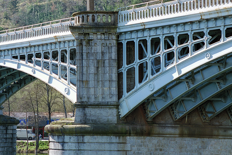 カオール鉄道橋。スパン36mの5連の鋳鉄製のアーチ橋。驚かされるのは、鉄道橋とは思えないような華麗な装飾。鋳鉄で作られた外側のアーチ部材には、一定間隔で仕切られ、その中央にラウンデル(小円盤)が付き、アーチと水平な頂部の中間には設けられたアーチ状の細い部材と、垂直材との連結部分にも、すべて小さなラウンデルが入っている。そして頂部にはモールディング(繰形装飾)が並び、鉄道橋には不要な高欄にも上下が丸くなった穴が連続して入っている。一方、ヴァラントレ橋に合わせて三角断面にした橋脚には全面にフルーティング(縦溝装飾)が入り、その頂部には、鋳鉄部分と同じようにモールディングと、穴開き高欄が付いている。1枚目の写真は、ほぼ全景。2枚目の写真は、橋脚の付近の一番装飾的な部分を撮ったもの。これほど装飾的な鉄道橋は、パリの都心のルーエル鉄道橋(No.32)やオーステルリッツ鉄道橋(No.57)くらいしか思い当たらない(ビル=アケム橋(No.33)の鉄道高架部分は、その下にある橋を渡る人が見るのできれいに作られていて当然)。「こんな田舎になぜ?」と思ってしまう。