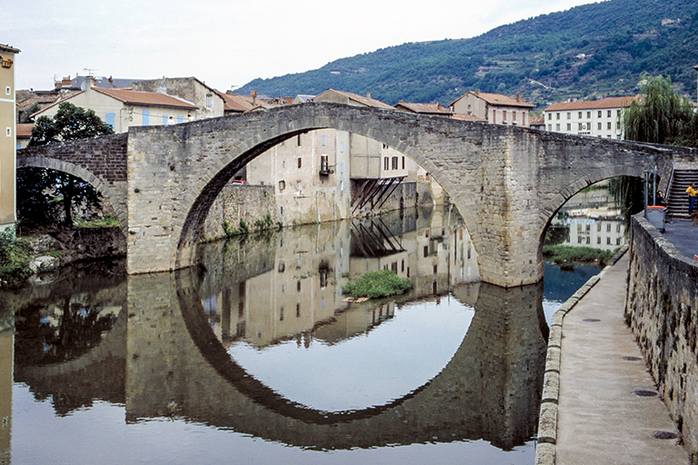 ヴュー橋は、情報量最小の橋。その背景には、1867年に町がこの橋を撤去する計画を立て、その対応がゆっくり進んでいるうちに、1886年に歴史的建造物となったため、手が出せなくなったという経緯が影響しているのかもしれない。だから、町のサイトでは、この橋のことを “通り一辺” の紹介で済ましている。ヴュー橋の建造年代には、13世紀初頭、1368年、1418年(1408年の洪水で大きく破損したので、1418年に再建)などいろいろな記述があり、どれを信用していいのか分からない。確かなのは、ソルグ(Sorgues)川に架かり、中央スパンが21.50m(両脇に、15.40mと9.60mの短いスパン)、幅3.25mの中世らしい緩やかな三角型をした石造アーチ橋(橋脚は大きな三角形)ということだけ。1枚目の写真は上流にある橋の上から撮ったもの。左岸側の小スパンのアーチの壁面が煉瓦造になっている。2枚目の写真は、下流側から接近して撮ったもので、橋の上部がかなり損傷を受けていることが分かる。何れにせよ、1867年から150年後の現在の行政も、この橋のことを大切には思っていないようだ。