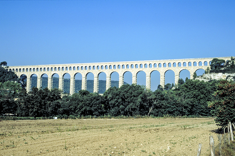 ロクファブール水道橋は、世界で最も高い(82.65m)石造の水道橋。1833~34年の干ばつによる給水制限を受け、マルセイユ市長のマクシマン・ドミニク・コンソラ(Maximin Dominique Consolat)は、デュランス(Durance)川からマルセイユに水を送る長さ80kmの水路の建設を決めた。その計画の最大の難関は、アルク(Arc) 渓谷。市長は、計画案の作成を技師のジャン・フランソワ・マヨール・ドゥ・モントリシェール(Jean François Mayor de Montricher)に依頼し、彼の “サイフォンを使わず水路橋を建設する案” を、多額の経費を要するにもかかわらず了承した。その結果、1847年に完成したロクファブール水道橋は、長さ393m、ガール水道橋を意識した3段構成の石造アーチ。1段目は高さ34.10m、スパン15mの半円アーチが12連、2段目は高さ37.60m、スパン16mの半円アーチが15連、3段目は高さ10.95m、スパン5mの半円アーチが53連と、樹木に埋もれた1段目より、遠くから見える2段目を重視する構造となった。水道橋は細部のデザインにも凝っていて、最上部にはモールディングを連続させ、1・2段目の橋脚の側面には一定間隔で石を張り出させてアクセントを付けるなど、水道橋としては例外的に華麗な構造物となった。3段目にはガール橋のような水路ではなく鉄管が敷設されたが、時代による変化に合わせて増設され、今ではマルセイユの水道の80%をまかなう貴重な存在。なお、橋の大規模な修復は2020~24年にかけて行われた。1枚目の写真は遠景で、水道橋の美しさが全く分からない。2枚目の写真で、ロクファブール水道橋の素晴らしさがよく分かる。3枚目の写真は、より近くから撮ったもの(当時のメモには、「トゲトゲの葉の茂る斜面の僅かな踏み跡を無理矢理登りつめて、橋を斜めに見上げる絶好のポイントまでやっとの思いで辿り着いた。汗が噴き出る。そのくらい暑い。快晴。文句を言う筋合いではないが、とにかく暑い」と書いてある。教会や城と違い、こうした物を撮影するのは、大変なことだ)。
