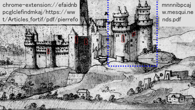 1枚目の写真は、西側から撮ったもので、左から、ゴドフロワ・ド・ブイヨン(エルサレム王国の初代君主)、アレキサンダー大王、アーサー王の塔。2枚目の写真は、ほぼ同じ角度から1855年に撮られた写真。批判はあっても、よくここまで復元できたものだ。3枚目の写真は、最も大きな2つの塔と、その塔の間に設けられた高い城壁を撮ったもの。4枚目は、図の上に長々と書いた資料にある図-13の転載。この城の絵は、1611 年にDuviertが描いた破壊される前のピエールフォン城(青い点線は、最も大きな2つの塔)。赤い長方形は資料の著者が描いたもので、そこに浅浮彫りの飾りがあることを示している。これを見た後で、3枚目の写真を見ると、同じ場所に浅浮彫りの飾りがちゃんと再現されている。5枚目の写真は、城の中の有名な中庭。ここで多くの映画が撮影されたとか。