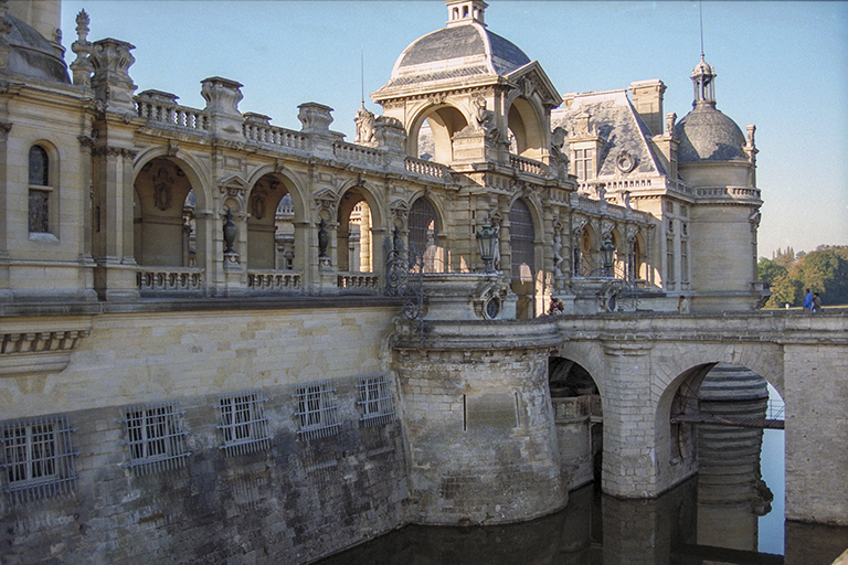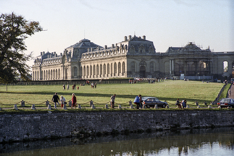 は複雑な経緯を辿る。11世紀起源の要塞に変化の一歩が訪れたのは1386年、シャルル5世の元宰相ピエール・ドルジュモン(Pierre d'Orgemont)が新しい要塞の建設を始めたのが契機。1484年、要塞は甥のギヨーム・ド・モンモランシーに遺贈された。ここで、フェール=アン=タルドゥノワ城で名が出て来たモンモランシー家が登場する。アンヌ・ド・モンモランシー(Anne de Montmorency)は、初代公爵となった1551年に、フェール=アン=タルドノワ城の橋を作った建築家ジャン・ビュラン(Jean Bullant)に、古い要塞の脇にプティ・シャトー(Petit Château)を作らせる。そして、第4代モンモランシー公爵のアンリ2世・ド・モンモランシーがリシュリュー(ルイ13世の宰相)によって処刑されると、シャンティイ城も没収される(1632年)。そして1643年にモンモランシー公位を継承したコンデ公妃シャルロット=マルグリットに城が返還されると、城はコンデ家の所有となる。「大コンデ」として知られるブルボン=コンデ公ルイ2世(Louis II de Bourbon-Condé)は、稀代の造園家アンドレ・ル・ノートルに庭園の設計を依頼。ル・ノートルは1662~84年にかけて、ヴェルサイユ宮殿に勝るとも劣らない大庭園を作り上げた。その後、後を継いだ子孫が18世紀にグラン・シャトー(Grand château)、アンギャン城(Château d'Enghien)、大厩舎(Grandes écuries)などを作るが、フランス革命(1789~95年)が起きると、グラン・シャトーは建設資材にするため解体される。革命を終わらせたナポレオンがコンデ公の最後の後継者を銃殺すると(1804年)、オーマール公アンリ・ドルレアン(Henri d'Orléans, duc d'Aumale、1822~97年)が後継者に選ばれた。父、ルイ・フィリップ1世の七月王政(1830~48年)が崩壊すると、息子のオーマール公爵はイギリスに亡命。1875年に戻ってくると、グラン・シャトーの再建を建築家オノレ・ドーメ(Honoré Daumet)に依頼する(1876~82年)。だから、今のシャンティイ城は、この時に作られたもの。相続人がいなかったオーマール公爵が、1884年、全財産をフランス学士院に遺贈する。そして、1898年4月17日、シャンティイ城はコンデ美術館(Musée Condé)として一般公開された。