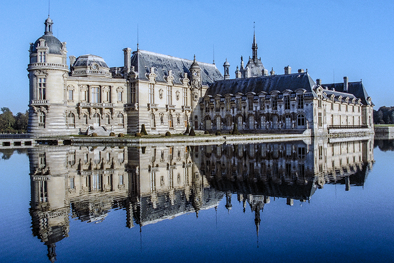 全体の構成を理解した上で、1枚目の写真はグラン・シャトーの入口。2枚目の写真はグラン・シャトーの南西側。3枚目の写真は私が一番好きな北西側。ともに、一種の水城だ。4枚目の写真は、シャンティイに招いた客人が泊まるアンギャン城。5枚目の写真は大厩舎。6枚目の写真は、グラン・シャトーの右のアクスのテラスから、その下の円形の池と、その向こうの入り込んだカナルと花壇の一部(右側)、そして、カナルの向こうの焦点の彫像を撮ったもの。写真は少し斜めからなので、その先に伸びるアクスは見えない。