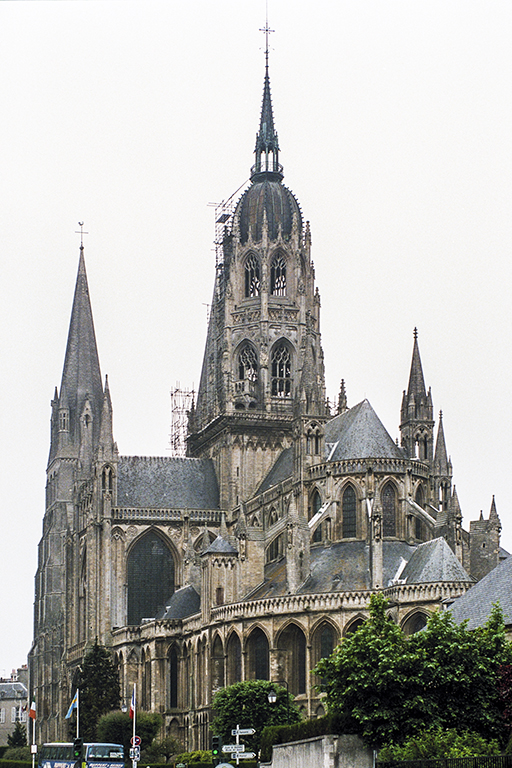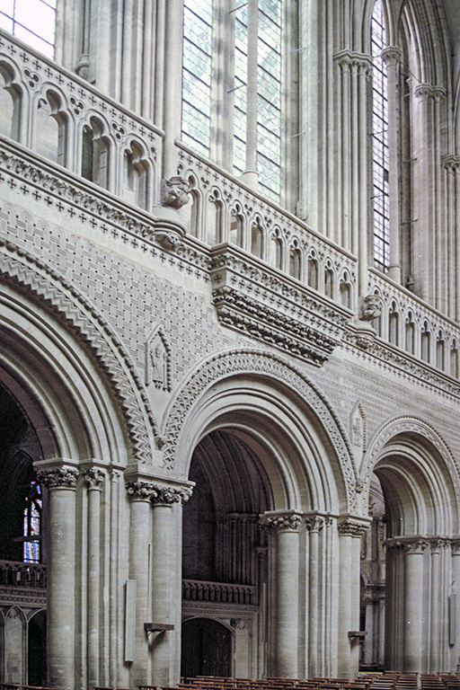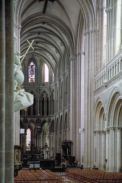 は、ロマネスクとゴシックの融合した建造物。現在残っているロマネスクの部分は、1040~80年にかけて作られた身廊の下部と、その背後の側廊。13~15世紀のゴシックの部分は、身廊の上部(天井高23.3m)、内陣、一対の鐘楼(高さ73mと75m)、翼廊の交差部の上の中央塔(高さ74.5m)。19世紀の半ば、政府の建築家ヴィクトル・リプリッチ=ロベール(Victor Ruprich-Robert)は、当時の流行に則り、大聖堂を中世の姿に戻したいと考え、愚かにも、1700年に設けられた内陣と身廊の間の石の仕切り壁を撤去した。その結果、その上に建つ中央塔が弱体化した(相談を受けたヴィオレ=ル=デュックは、何もしなければ塔は崩壊すると報告した)。近くで鉄道工事をしていた 有名な鉄道技師ウジェーヌ・フラシャ(Eugène Flachat)が交差部の基礎工事を行い、中央塔は撤去を免れた。1枚目の写真は、内陣側から撮った全景。こうして見ると、ほぼ同じ高さなのに、中央塔が断然高く見える。こちら側から撮ったのは、ファサードの前の広場が狭く、双塔を入れにくいから。もちろん、そちら側から見れば、中央塔など見えない。2枚目の写真は、身廊から内陣を見たところ。身廊の下部の左右のアーチがロマネスクの半円アーチであるのに対し、身廊の上部と、内陣のすべてはゴシックの尖頭アーチ。3枚目の写真は、ロマネスク時代の身廊下部の半円アーチ(1120~30年)に施された繊細な装飾。