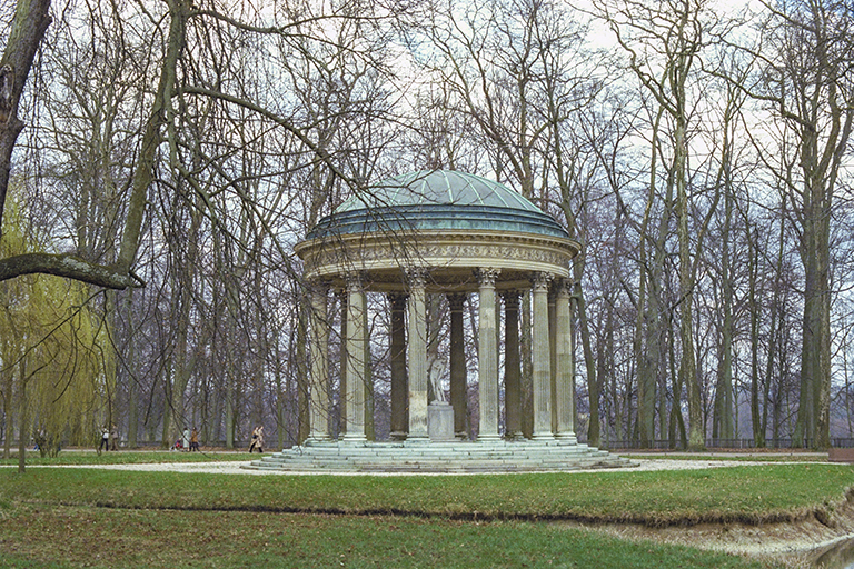 ⓫製粉所。2枚目の写真は、ビリヤードの家と王妃の家、左端に鳩小屋。3枚目の写真は、調理場とリネン室。4枚目の写真は、王妃の家の330m南にある愛の神殿(1778年)。12本のコリント式の柱で囲まれ、ドーム屋根を載せた古代ギリシャを想わせる建物。5枚目の写真は、参考までに半世紀以上前に作られたイングランドのストウ庭園(Stowe Gardens)のロトンド(Rotondo、1721年)。柱の数が12本か8本か、円柱の柱頭がコリント式かイオニア式か、中央に立っているのが、「ヘラクレスの棍棒で弓を作る愛の神」か「ヴィーナス」かが違っているだけの “定番構造物”。