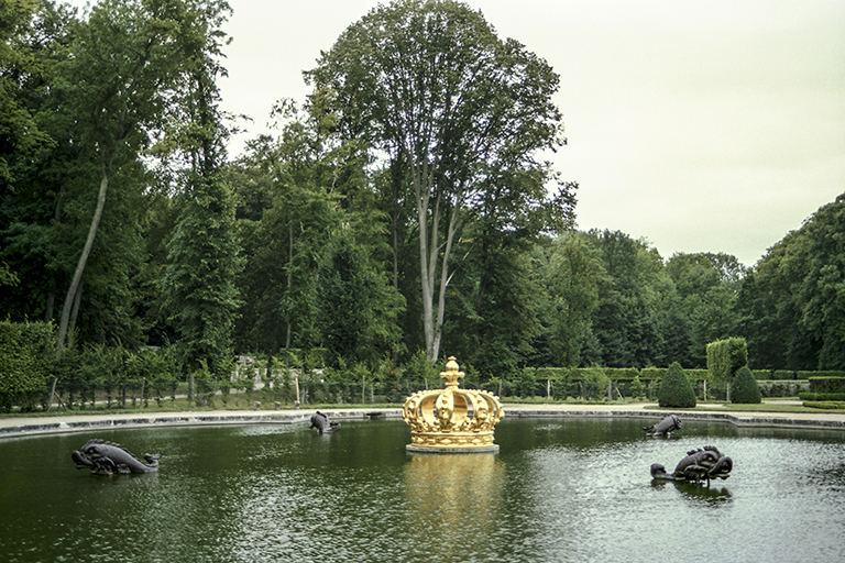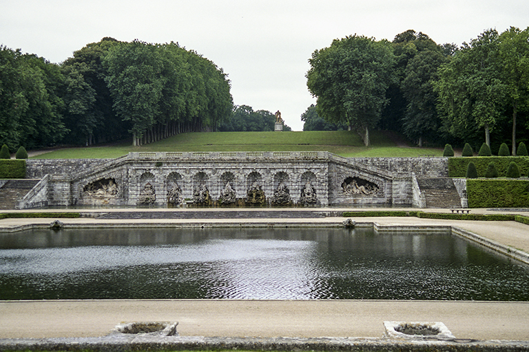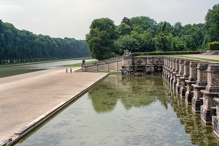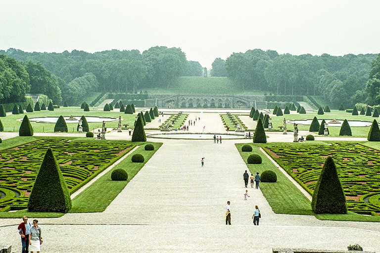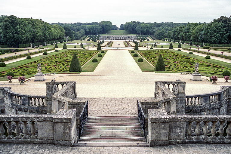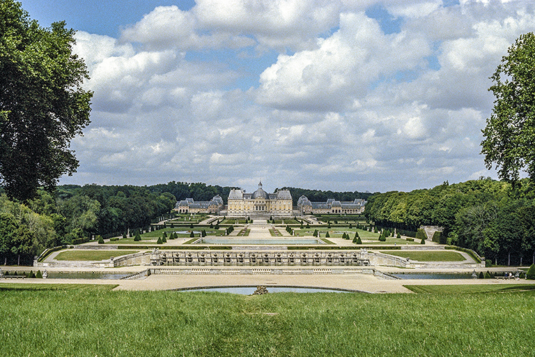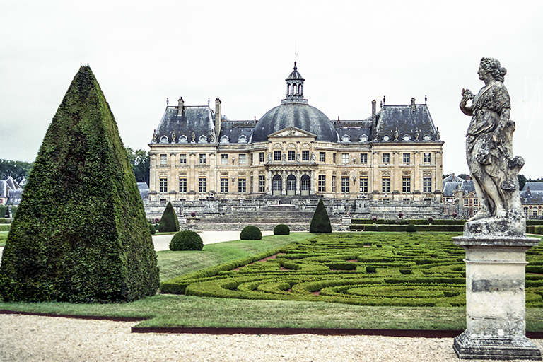 これを作り上げた天才的造園家は、アンドレ・ル・ノートル(André le Nôtre)。城館を担当した建築家のルイ・ル・ヴォー(Louis le Vau)、館内の美術を担当した画家シャルル・ル・ブラン(Charles le Brun)の3人。財務総監(Surintendant des Finances、1653~61年)のニコラ・フーケ(Nicolas Fouquet、1615~80年)のために豪華な城と庭園を作った(1656~61年)。そして、歴史上有名な1661年8月17日。フーケ(46歳)はルイ14世(22歳)と約600名の延臣と高級娼婦を招き、城で豪勢な祝賀会を開いた。国王を遥かに凌ぐ豊富な資金力に激怒した若きルイは、9月5日にフーケを逮捕させ、公金横領と不敬罪で裁判にかけた。1664年12月21日の判決で、フーケはピネロロ要塞での終身抑留となった(1680年死亡)。祝賀会での様子は、19世紀の小説家アレクサンドル・デュマの『ブラジュロンヌ子爵』の一分冊、『鉄仮面』の中で詳細に描かれている。それ以後、ルイ14世の造園家となったル・ノートルは、ヴェルサイユ宮殿の庭園、ルーブル宮の前のチュイルリー(Tuileries)庭園の整備、フーケを敵視していたコルベールのソー(Sceaux)城の庭園などに携わる。