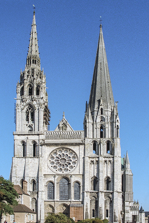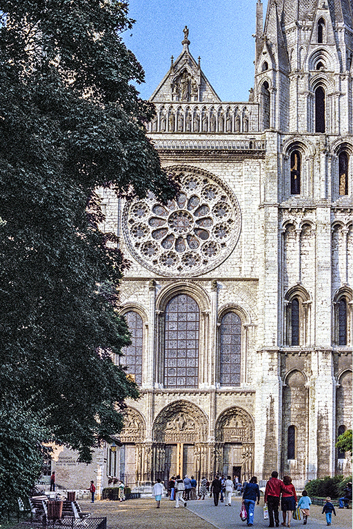 【世界遺産】私がフランスで、パリ以外に何度も訪れた場所の一位が、シャルトルのノートルダム大聖堂。2回目は1回目の6年後、3回目はその5年後、4回目はその5年後。その後、10回以上海外に行っているが、すぐ近くを通った時も寄っていない。なぜかと言えば、シャルトルの唯一最大の魅力であるステンドグラスがどんどん汚れて 美しく澄んだ「シャルトル・ブルー」が見えなくなってしまったから。ここで用いた内部の写真は、3回目の時のもの。シャルトル大聖堂は、1194年の火災で破壊されたロマネスク様式の大聖堂の跡地に作られた。歴史上の火災(Les incendies dans l'histoire)というサイトを見ると、「意図された火災? ノートルダム・ド・シャルトル大聖堂のケース(Incendies programmés ? Le cas de la cathédrale Notre-Dame de Chartres)」という、アルノ・タンベール(Arnaud Timbert)による解説がある。その中でタンベールは、①火災は1194年6月10日に起きた。②火災の直後からゴシック様式でより多くの巡礼者を収容できるような大聖堂の建設が始まり(建設資材がすぐ調達できた)、早くも1226年には基本的な工事が完了した。③巡礼者にとって一番大切な「聖母マリアの肌着(la chemise de la Vierge)」が奇跡的に地下室から見つかった、などの状況から、古いロマネスク教会を建て替えるための人為的な火災だったという仮説を立てている。火災で唯一燃えなかったファサードの高さ103mの南塔(1150年)は別として、身廊と内陣は1210~15年にかけて作られた。身廊(天井の高さ37.50m)は、その後の、ランスやアミアンでも踏襲された3層構造(2層目は背が低く窓のないブラインド・アーケード)を使用。内陣は多くの巡礼者が入れるように二重の回廊とし、内陣の奥の後陣には礼拝堂(大3、小3)も設けられた。ファサードの北塔(高さ115m)だけは、1516年の完成と随分遅くなる。