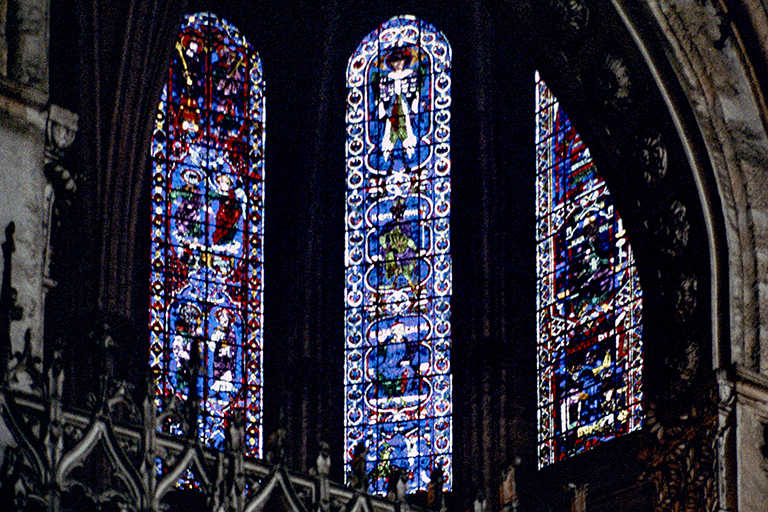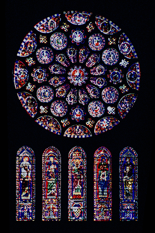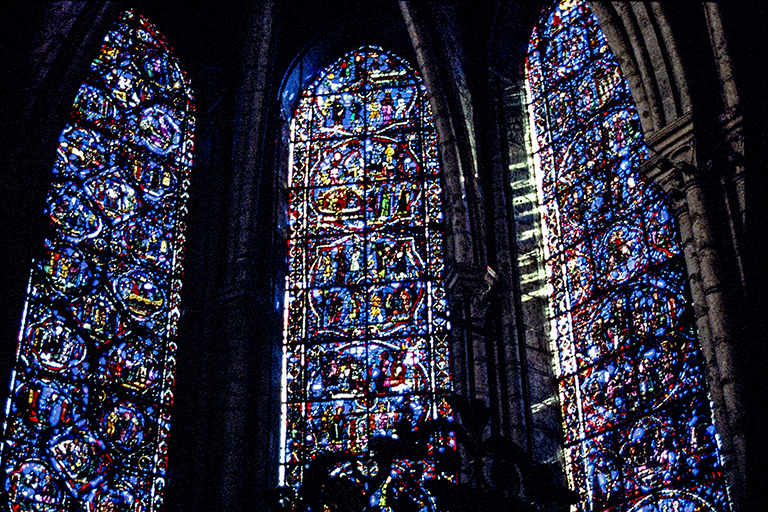 シャルトル大聖堂には戦争や革命を免れた12~13世紀のステンドグラス2600㎡が当時のまま残っている。これは、一番貴重な12~13世紀のステンドグラスとしては世界最大の規模で、シャルトルの最大の魅力。ステンドグラスの色の基調は紺色なので、「シャルトル・ブルー」と呼ばれている。最初に作られたのがファサードと翼廊のバラ窓(1225~30年)。すべてのステンドグランスの完成は1240年。奉献は1260年10月24日。