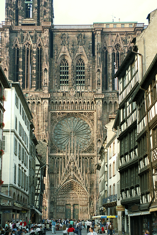 は、建設が始まった当時は神聖ローマ帝国の都市(ドイツ語を話す町)だったため、大聖堂の形式にも様々な変遷の あとが見られる。1196頃~1220年までに翼廊の北側が作られるが、施工者は神聖ローマ帝国の技術者だったため、フランス式のゴシック構造には疎く、慣れたロマネスク様式に、“知識不足の交差リブ” を付けた形で、1220頃までに翼廊の北側を完成させた。その後、新しい技術者が招かれ、盛期ゴシック様式で身廊が完成(1275 年)。身廊のファサードを飾る有名なバラ窓のステンドグラスは、Erwin de Steinbach(1244~1318年)の作品(制作年は不明だが当然14世紀に入ってから)。1340~60 年にかけて、ファサード北塔(左側)の基部が完成。その上に、ヨーロッパの中世で最も高い尖塔(高さ142 m)が1439年に作られた。ストラスブールが、ルイ14世の軍に包囲され、フランス領になったのは1681年。お陰で、革命による彫像の破壊(1792~93年)が行われ、19世紀は修復に追われた。1871 年にはプロイセン軍によりストラスブールが包囲され、翌年ドイツ帝国に併合。1919年には第一次世界大戦を経てベルサイユ条約でフランスに返還。複雑な経過を辿った。