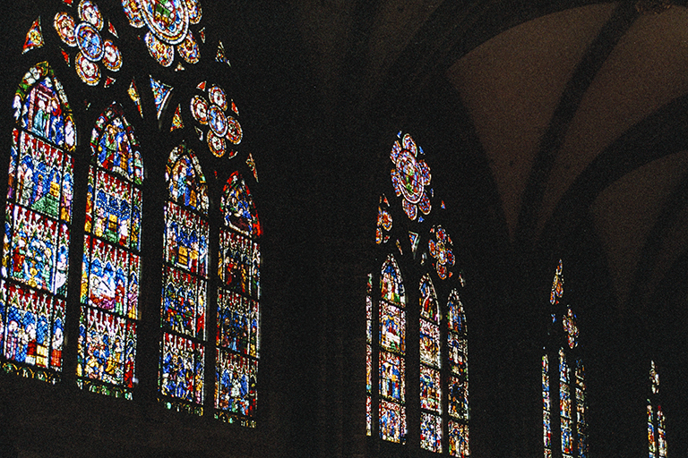 1枚目の写真は、大聖堂の正面にあるメルシエール(Mercière)通りの入口から、1回目に行った時にファサードを撮ったもので、高さ142mの尖塔もちゃんと映っている。2枚目の写真はその9年後に、メルシエールの奥から大聖堂を見上げて撮ったもので、細部は分かるが、尖塔はカットした。3枚目の写真は、身廊の上部に残った中世のステンドグラス。4枚目の写真は、“16 枚の花びら” として有名なばら窓のステンドグラス。