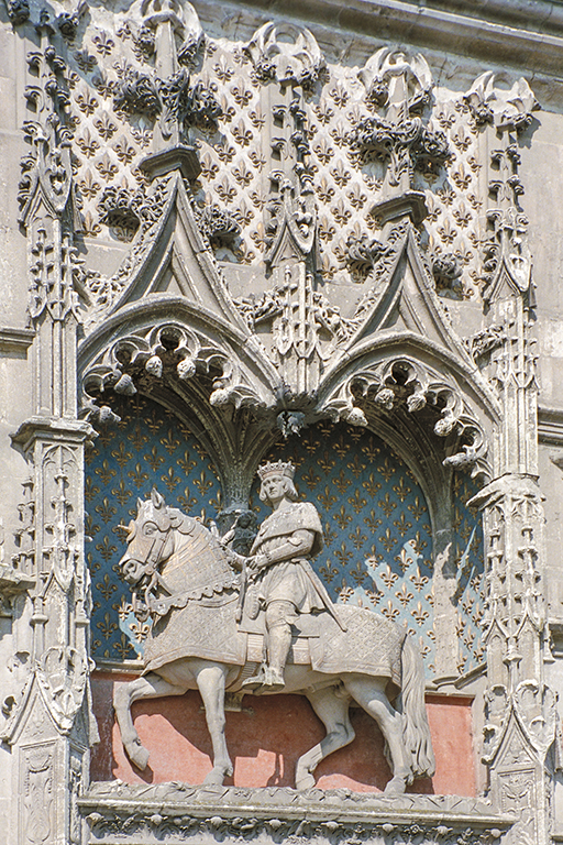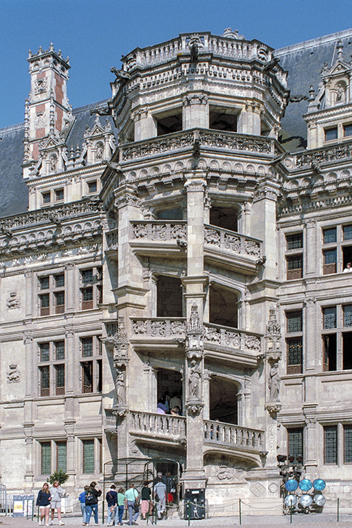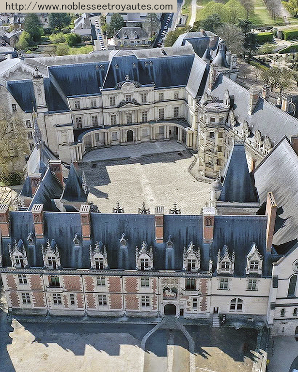 【世界遺産】ブロワ王城は、ルイ12世(1498~1515年)から約1世紀の間、フランス王の居城だった。ブロワ王城を、王の城として築いたルイ12世は、建物全体は赤煉瓦、建物の角や窓の縁には白い石を用いたフランドル的(石のないフランドル地方で発達した煉瓦の建物)なゴシック棟を1498~1503年と短期間で建てた。それは、下の俯瞰写真の下側の棟。棟の正面右にある入口の真上にはルイ12世の騎馬像(Statue équestre de Louis XII)が、壁を飾っている。ルイ12世に続き、フランソワ1世(1515~47年)が、白い石だけでルネサンス様式の建物を1515~18年と、これも短期間で建てた。俯瞰写真の右側の建物。この建物の中庭側の中央に、有名な螺旋階段が見える。最後に、アンリ4世の子、ルイ13世の弟のオルレアン公ガストン(1608~60年)が、1635年から俯瞰写真の上部の棟を建て始めるが、経費の問題もあり、1660年に死去した時も未完成のままだった。