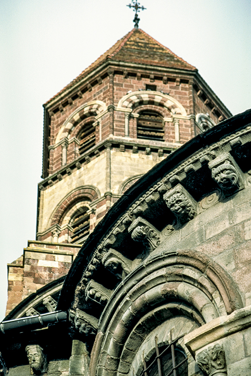 はオーヴェルニュ地方最大の教会で、スペインの聖地サンティアゴ・デ・コンポステーラに至る巡礼路に建っている。建設工事は12世紀の最初の四半期から 13世紀まで続いた。1枚目の写真は、内陣側から撮った翼廊の交差部に聳える鐘楼(19世紀の再建)。驚かされるのは、その多彩な美しさ。屋根瓦は、まるでブルゴーニュのように多色の釉薬をかけた小さな瓦が八角形の尖塔を覆い、その下の階には、まるで煉瓦のような赤砂岩が使われ、石灰岩砂岩が窓の上部を飾っている。その一段下は、色が逆転し、壁は石灰岩砂岩、窓脇は赤砂岩となる。さらに、その一段下は、赤砂岩、石灰岩砂岩、玄武岩、グラニュライト、灰色とピンクの大理石が、不規則に壁全体を覆っている。その下には、内陣の半円形の壁があり、窓の上部は、白い大理石と玄武岩が繊細な模様を作り、その直下の窓には、装飾的な柱頭の付いた柱による連続アーチが並んでいる。一番下の礼拝堂のだけは地味だが、この礼拝堂と上の内陣の軒下にはモディリオンが付いている。2枚目の写真は、その礼拝堂のモディリオンを強調して、鐘楼の上部2酸と一緒に撮ったもの。3枚目の写真は、礼拝堂のモディリオンだけ撮ったもので、人の顔、猛獣の頭や鳥や植物、怪物の頭、幾何学模様などが如何にもロマネスク的で、その隙間にもすべて簡単な飾りが入れてある。4枚目の写真は、ファサードの中央に設置された小型の角型鐘楼(19世紀に再建)を、身廊の横から撮ったもの。まだら模様の壁が素敵だし、軒下はモディリオンで溢れている。