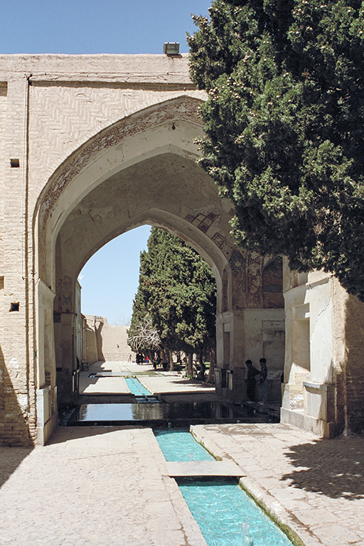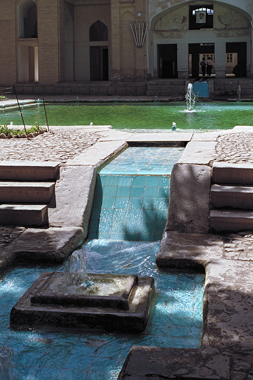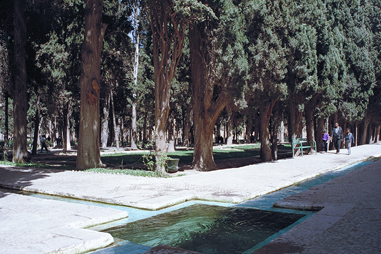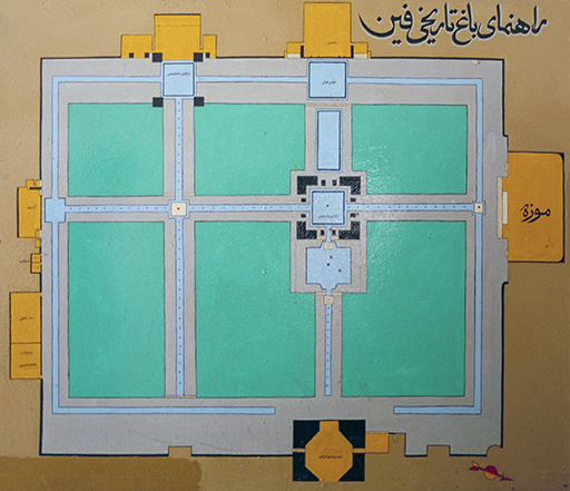 約1000年前に作られたフィンの庭園 (Bāgh-é Tārikhi-yé Fin)。時代を超えて現存する最も美しい古典的なイスラム庭園の一つ(面積約1.5ha)。イラン中央部のフィンの庭園は、最も古いタイプのオアシス庭園で、砂漠の真ん中に造られた「楽園庭園」の典型的な例。水路には、貴重な水を強調するように青いタイルが敷かれ、その中央には、高さ数cmの小さな噴水が、一定間隔で直線状に配置されている。一方、庭園のもう一つの構成要素である樹木は、当初の果樹がヒノキに置き換えられた。
