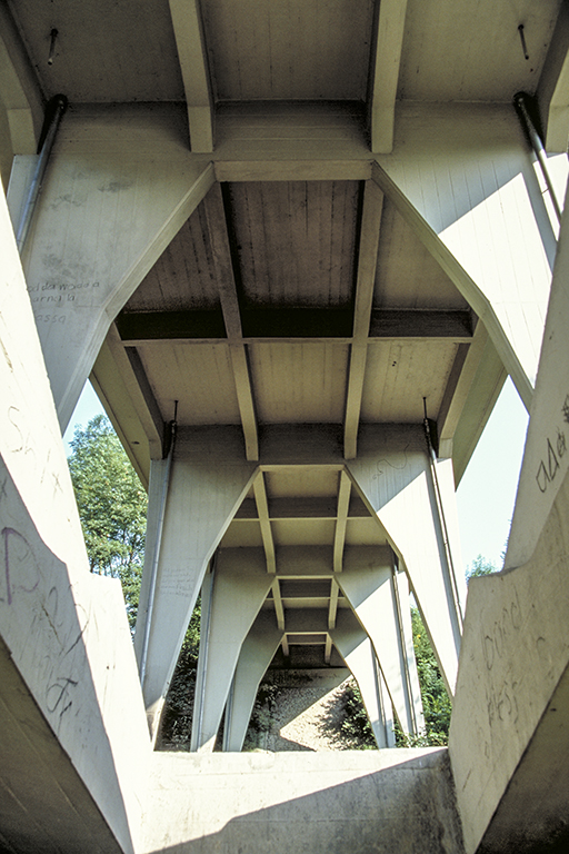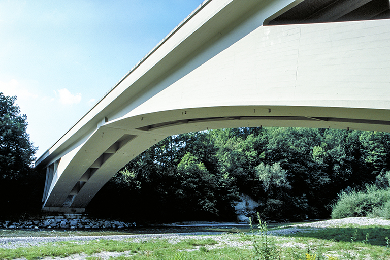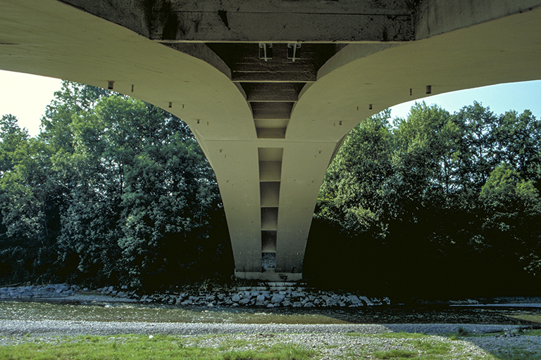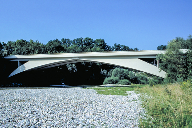 「マイヤール・タイプ」の3ヒンジ・アーチの進化形(1933年)。マイヤールにしては、山の中の1車線橋ではなく、平野部の2車線橋(スパン72m、全長135m)だったので、交通量を考えて、アーチ・リブが強靭な逆三角形になっている。1枚目は斜め横からの写真、2枚目はほぼ真横からの写真、3枚目は下部が見えるほど近づいた写真、4枚目は真下から撮った写真、5枚目は逆三角形のアーチが路面を支える柱を下から撮った写真。