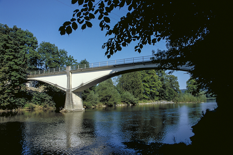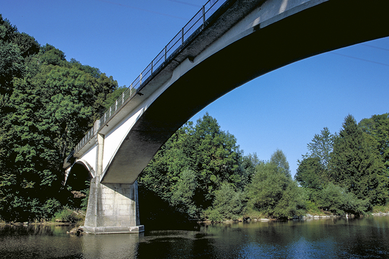 ローベル・マイヤールが2つ目に架けた「ツーオツのイン川橋」タイプの3スパン、箱桁のRC橋。1スパンでなく2スパンになっているところが違うだけの、田舎道の橋。ツーオツのイン川橋のところで述べた「箱桁端部の縦の亀裂」が入った後だったが、構造上の危険性はないと判断されたので、形式はそのまま踏襲された。1・2枚目の写真は橋の両側を撮ったもの。3枚目は橋の下から、4枚目の写真は中央の橋脚を撮ったもの。