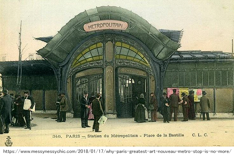 (1902年)。エクトル・ギマール(Hector Guimard)が、1900~13年の間パリ・メトロポリタン鉄道会社のメトロ入口の第一世代を担当した際、メトロの入口は5種類作られた。一番立派なのは、エトワール(Étoile)駅入口(1900年)とバスティーユ(Bastille)駅入口(1905年)。2つとも市民に気に入られることなく、無関心かつ当然のように取り壊されてしまった。それは、この奇妙なデザインが、一流の(新古典やネオ・ルネサンスに傾倒して創造力に欠けた)建築家からは軽蔑され、一般大衆からも好まれなかったから。ギマールのメトロ入口で2番目に立派なのが、このドーフィーヌ門駅入口。パリ中捜してもこれ一つしか残っていない。曲がった鋳鉄と波板ガラスを用いたアール・ヌーヴォーのデザインと、彼がデザインした「METROPOLITAIN」の字の組み合わせが生みだした「メトロ様式」だ。ドーフィーヌ門駅入口は、それに加えて壁面がオレンジ色で彩色され、「ベランジュ館」のところで紹介したブリュッセルのタッセル・ホテルの階段を思わせる繊細な模様で飾られている。まさに、芸術品と言える出来栄えで、パリで最も美しいアール・ヌーヴォーのメトロ入口だが、場所が悪くて人通りはほとんどない。最初に紹介するのが、既に壊されてなくなったバスティーユ駅の入口の古写真。2枚目の写真は、普通に斜め横から撮ったもの。3枚目の写真は、正面から撮ったもの。4枚目は、オレンジ色の壁面の拡大。