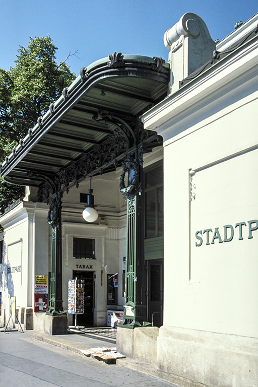 「ベランジュ館」のところで、他国の新芸術について述べた。その中で、ウィーンについては、地下鉄と関係するので、もう少し詳しく紹介しておこう。ウィーン市営鉄道の建設が決まった時、オットー・ワーグナーは意匠面での顧問として鉄道の駅舎から高架橋に至るまで統一的なデザインを指導を依頼された。だから、彼の作品で現存するほとんどの建造物は、市内に点在する駅舎と高架橋。彼はまた、市内のドナウ運河に関係した建物や堰のデザインにもかかわった。これではまるで土木技師だ。本来の建築家としては、公共的な建築物の依頼はゼロに近く、唯一の作品は、1906年のオーストリア郵便貯金銀行(Österreichische Postsparkasse、現在のオーストリア科学アカデミー、オーストリア科学基金の建物)くらい。何となくエクトル・ギマールに似ている。参考までに、ワーグナーのベストの駅舎であるカールス広場駅(Karlsplatz)駅(今では、オットー・ワーグナー博物館)の典型的なゼツェッショーン(Sezession、セセッション)様式を1枚目に、通常の駅舎の一例として、市立公園駅のアール・ヌーヴォー的な入口を2枚目に示す。