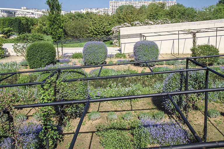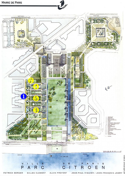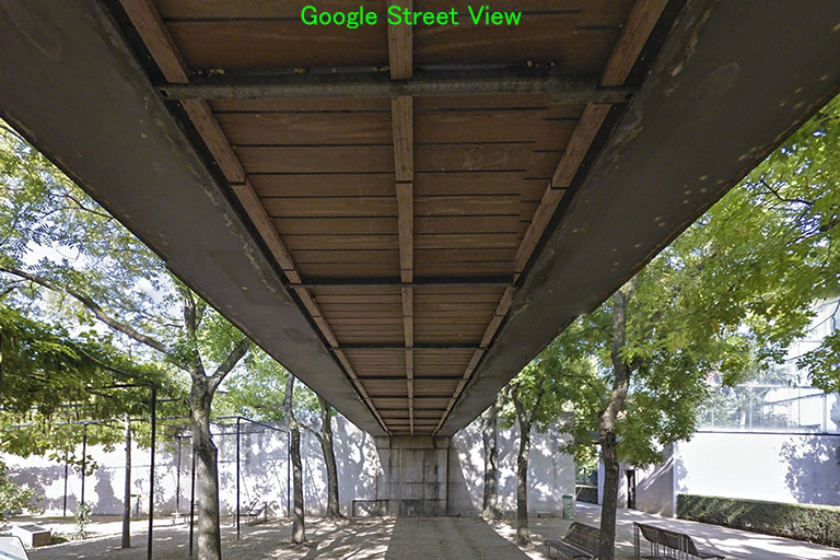 “日陰の植物の家” の東側から、この公園の真髄が始まる。東(地図の真上)に向かう通路が2本、“地表の通路” と “歩道橋の通路” が並行して約130mにわたって続く。“地表の通路” の左側には、寒さに弱い木を1~2本ずつ入れた “巨大な温室箱” が6つ並んでいる(1枚目の写真、❶)。その温室の一つを、“歩道橋の通路” から撮ったものが2枚目の写真。温室に入るには、“歩道橋の通路” から、簡単な木の橋で、“地表の通路” の上を渡る。3枚目の写真は、“歩道橋の通路” 歩道橋の通路の写真(❷)。両側から木の枝が通路を覆っているので、夏でも木陰にいるようで気持ちがいい。この歩道橋、橋桁だけは鋼鉄だか、歩く部分は木の板が並べてあり、その下は一定間隔で細い鉄の棒が支えているだけ(自然の材料に徹底的にこだわっている)。現地では、そこまで気付かなかったので、グーグル・ストリートビューの写真を4枚目に示す。そして、この歩道橋の通路の南側に6つの庭園が並んでいる。セーヌ川に近い西側から、“青の庭”、“緑の庭”、“橙の庭”、“赤の庭”、“銀の庭”、“金の庭” という名が付いている。これらの中で一番素敵だったのは2つ。“青の庭”(5・6枚目の写真、❸)と、“銀の庭”(7・8枚目の写真、❹)。“青の庭” では、青系の花が咲き揃い、“銀の庭” では、季節により葉が銀色っぽくなる樹種を選んで植えてある。“橙の庭”(9枚目の写真、❺)は、オレンジ色の花が咲いる木と草花が少しあったが、地面の半分以上が小石で覆われ暗い感じがしたし、“緑の庭” には木が密集していただけ。赤と金は全く冴えなかった。