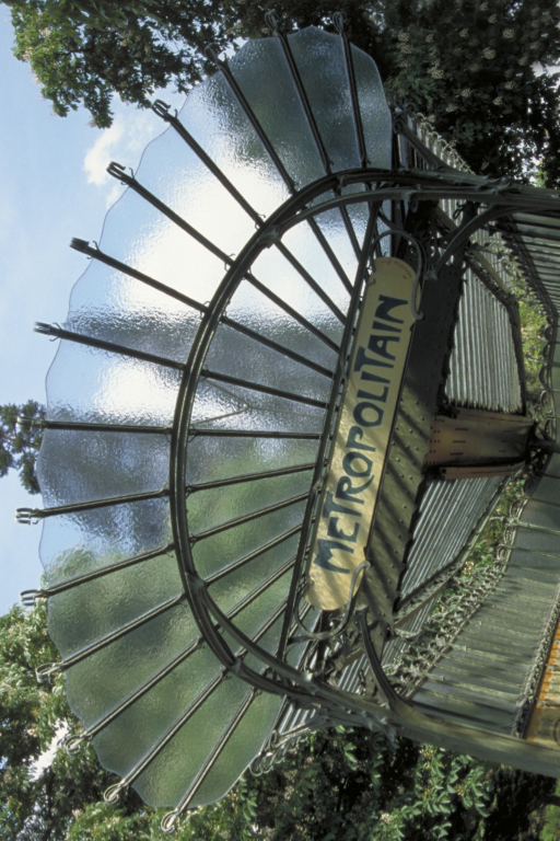 アベス駅入口(1901年)。メトロの入口(5種類)の中で3番目に立派なのがアベス駅入口。ここも、パリ市内で1ヶ所残っているだけ。それも、元はオテル・ド・ヴィル(Hôtel de Ville)駅入口にあったものを、1974年に移したもの。シャトレ(Châtelet)駅入口にも同じ形式の入口があるが、実物ではなくレプリカ。ドーフィーヌ門駅入口にあったオレンジ色の美しい壁面がなくなり、ガラスの屋根の飛び出した庇も短くなり、途中の半円形鋳鉄で終わっている。それでも、ドーフィーヌ門駅と違って繁華な場所にあるので、市民に最も親しまれているアール・ヌーヴォーのメトロ入口になっている。1枚目の写真は全景。2枚目の写真は短くなった庇。3枚目の写真は、同じ角度で、ドーフィーヌ門駅の大きな庇を対比して示したもの(ワザと斜めに傾けた。拡大率が違うので一見小さく見えるが、「METROPOLITAIN」の大きさは同じなので、外に向かって放射状に伸びる部分の大きさが分かる)。