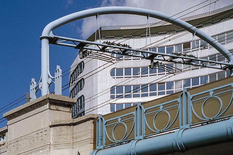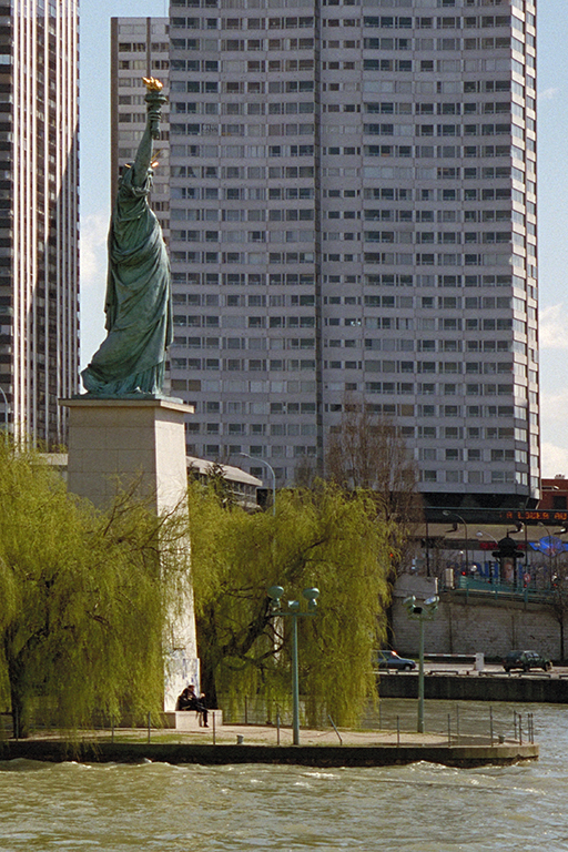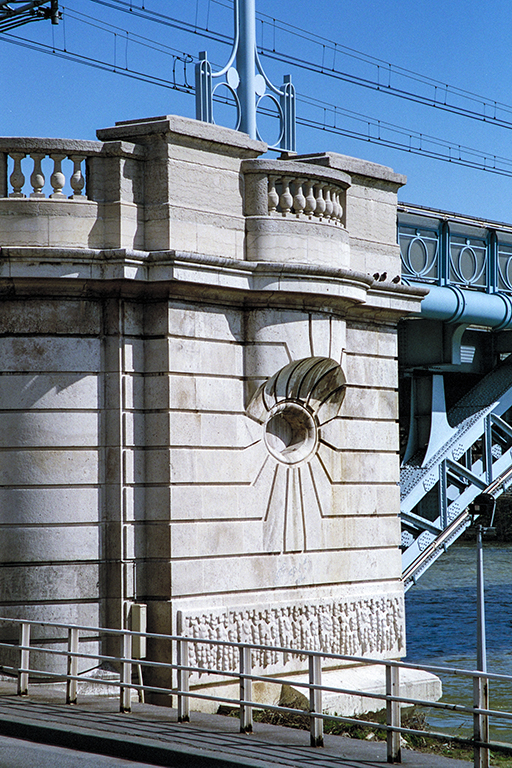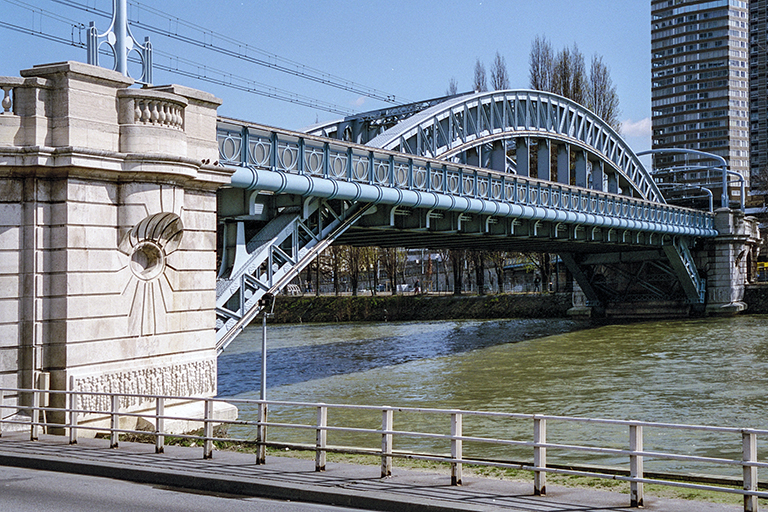 は、ナポレオン3世の治世中に建設されたパリを周回するプティット・サンテュール(Petite ceinture)鉄道のドゥーテイユ高架橋(Viaduc d’Auteuil、1863年)が、1900年のパリ万博の会場へのアクセスに不便だったことから作られた。この鉄道橋は、セーヌ川の中央に作られた長さ890m、幅11mの人工島、シグネ島(Île aux Cygnes、右岸側と左岸側の流れを均等化するために1825年に作られた)を斜めに横切っている。橋の見どころは右岸側のスパン85.7mの中路の鋼アーチ橋。設計は建築家のボネ(A. Bonnet)。鋼アーチ部はごく普通の橋。しかし、どこにも書かれてないが、①石の橋台(曲面欄干、中央の大きな曲面の欄干の台石とその中心に設けられた円から放射線状に描かれた線、最下部の多数の人の列を思わせる飾り)、②曲線を描く架線柱と、柱の取り付け部の円と半円で構成された補強材、③高欄の円と逆半円を重ねた連続飾りは、アール・ヌーヴォー的な試みを強く感じさせる。1枚目の写真は、エッフェル塔を含めた全景、2枚目の写真は、アーチ橋の全体像、3枚目の写真は、上記①の橋台、4枚目の写真は、上記②と③の架線柱と高欄。なお、シグネ島の下流の先端(ルーエル鉄道橋から350mほど下流)に、自由の女神像が建っている(5枚目の写真)。フランス政府は、1876年、アメリカ建国100周年を祝して自由の女神像(高さ45.5m)をニューヨーク市に贈ったが、その返礼として、パリのアメリカ人委員会が、フランス革命100周年を記念して1889年にパリに寄贈した像(高さ11.5m)。この像は、1998~99年に「日本におけるフランス年」を記念して東京のお台場に貸し出され、その後、ここに戻された。お台場には1999~2000年にクーベルタン鋳造工房で制作されたレプリカが2000年末に再設置された。