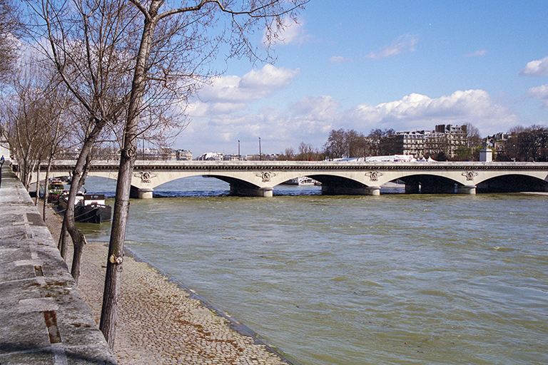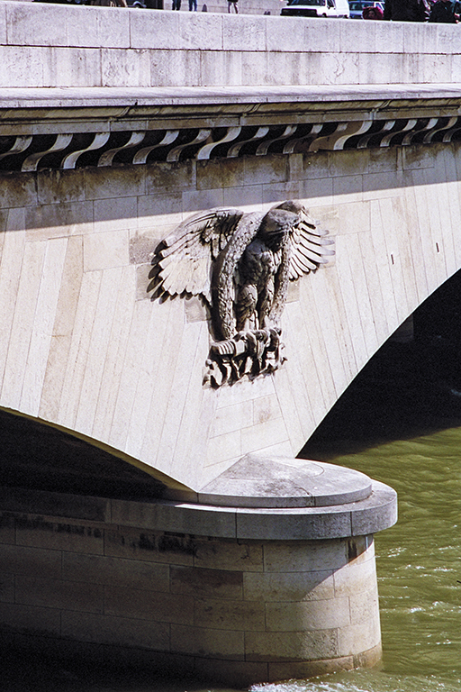 1枚目の写真は、少し離れた場所からイエナ橋を撮ったもの。コンコルド橋と同じ、ペロネ式の「半円アーチの上部だけを切り取った扁平なアーチ」が使われていて、ライズ比(高さ/スパン)は約0.12と、コンコルドの0.13より一段と扁平になっているが、橋脚の幅はスパンの約1/8で、コンコルドの1/10.6に負けている。2枚目の写真は、エッフェル塔の下部を入れて、近くから橋を撮ったもの。拡幅部分が、独立した橋脚になっていることが分かる。3枚目の写真は、ナポレオンがこだわった「皇帝の鷲」の彫刻。なお、ユネスコの世界遺産「パリのセーヌ河岸」について、ユネスコのサイトには、「サン・ルイ島の東端にかかるシュリー橋から、左岸にエッフェル塔をのぞむイエナ橋までが、世界遺産に登録されている」と書かれている。しかし、個別の橋を見ると、アレクサンドル3世橋、コンコルド橋、ポン・デ・ザール、ポン=ヌフの名前はあがっていても、イエナ橋そのものが世界遺産だと明確に書いた資料を見つけることができなかった。そこで、上のユエスコの文章は、単に「パリのセーヌ河岸」の範囲を示すもので、その中に入るすべてが遺産になる訳ではないので、イエナ橋は除外して表示する。間違っていると分かった段階で表示を改める。
