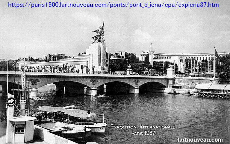 は、極めて数奇な運命を辿った橋。1806年のイエナの戦いでプロイセンに勝利したナポレオンが、1807年に陸軍士官学校(École militaire)から見下ろせる橋の建設を命じたのがスタート。彼は、完成した橋に、プロイセンに勝利した記念に「皇帝の鷲」を刻むことが夢だった。橋は1808に着工、1814年に完成したが、彼が退位させられたのは1814年の4月4日。どこを見ても、何月に完成したか書いてないが、完成した時点で「皇帝の鷲」が橋脚の上に付いていたことは確か。ナポレオンは、1815年にエルバ島を脱出し、パリに戻って復位し「百日天下」の末、セントヘレナに幽閉された。ルイ18世は、イエナ橋を陸軍士官学校橋と改名し、「皇帝の鷲」を取り除き、代わりに、ルイ(Louis)の “L” の字を付けた。1852年にナポレオン3世が第二帝政の王位に就くと、橋の名はイエナ橋に戻り、新しい「皇帝の鷲」がジャン・フランソワ・ムレ(Jean-François Mouret)によって作られ、再び橋を飾る。その後、1900年のパリ万博の期間中、イエナ橋は、エッフェル塔の真正面にあることから、博覧会の中核的な橋となり、両脇に金属製の歩道橋が追加され、橋の幅は14mから19mになった(1枚目の絵葉書参照)。さらに、1937年のパリ万博では、コンコルド橋のように、橋の両側から石橋脚が付け加えられ、橋の幅は35.8mになった(2枚目の写真)。3枚目の図は、グーグル・マップで、橋の周辺の状況を示したもの。陸軍士官学校は橋からちょうど1km離れている。1枚目の絵葉書は、1887年に出来たエッフェル塔側から、橋の向こうのトロカデロ会場を撮ったもので、イエナ橋が如何に重要な場所にあったかが良く分かる。2枚目の絵葉書では、シャイヨー宮が右端に写っているが、宮殿は1937年のパリ万博の中心パビリオンだった。イエナ橋は 常に万博と一緒にいる。