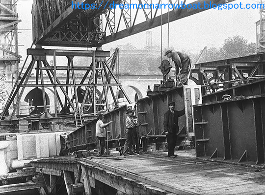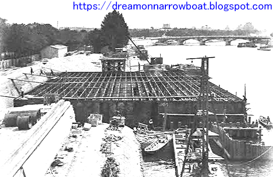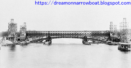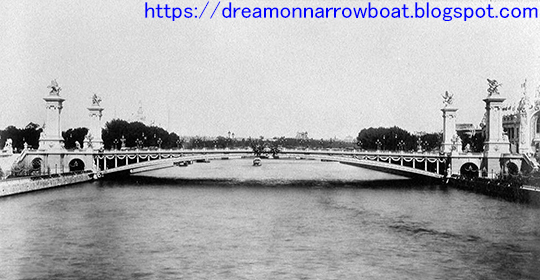 は、1891年に皇帝アレクサンドル3世とフランス共和国大統領サディ・カルノーの間で締結された露仏同盟の象徴的存在(橋の名前も、そこから来ている)。そして、1900年のパリ万博の象徴でもあった。橋は、アンヴァリッドの正面に架けられ(といっても、約650mも離れてはいるが)、反対側には、万博の会場として建てられたグラン・パレ(Grand Palais)とプチ・パレ(Petit Palais)が、橋から北に伸びるアレクサンドル3世大通り(現在のウィンストン・チャーチル大通り)の左右に建っている(橋から入口まで約170m)。橋には大きな制約が課せられた。それは、会場側から橋の向こうのアンヴァリッドが完全に見えないといけない、つまり完全に水平でなくてはならないということ。それに、航行のさらなる邪魔にならないよう、途中に橋脚は設けないようにするため、フラットに近い単スパンのアーチ橋が要求された。それに応えたのが、19世紀末のフランスで、金属橋の最も偉大な設計者と言われたジャン・レザル(Jean Résal)。彼が考案したのは、スパン107.5mの鋳鉄アーチ橋。ライズ比(高さ/スパン)は僅か0.059(コンコルド橋を作ったペロネの他の最高作で0.09、以前にも引用した「日本一扁平」とされる長野県の鋼アーチ橋でも0.09)。これほど扁平だと、膨大な水平方向の推力が発生するので、両岸はよほど頑丈に作らないといけない。https://dreamonnarrowboat.blogspot.com/2018/05/la-construction-du-pont-alexandre-iii.html というサイトに、かつて橋梁道路学校(École des ponts et chaussées)が収録した写真が掲載されていたので、それを、まず3枚連続して掲載する。1枚目は工事に着手してから最初の写真(1897年5月28日)。2枚目は台(plateforme)の建設が始まったところ(6月11日)。3枚目は完成した台(7月4日)。台の構造は、https://www.worldfairs.info/forum/viewtopic.php?t=606-pont-alexandre-iii というサイトに載っている(4枚目の図)。そして、再び前のサイトに戻り、5枚目では、台の上にケーソンの列が立っている(8月3日)。これに対応した図が6枚目にある。これは、作業員が上部のケーソン(気閘)から中に入り、圧縮空気の中を底まで降りて行き、底から順次コンクリートを詰めていく装置。ケーソンの場所を上げて行くことで、巨大なコンクリートの立方体が作られた。図の下の7枚の写真は、完成した大きな台の上に、橋を架けるための巨大な作業用のトラスがセーヌ川の上に張り出していく様子(1898年8月20日)。このトラスは最終的に対岸まで達し、その下に、木製のアーチ形の台が作られ、工場から運ばれてきた鉄のアーチ部材が組み立てられて行く(8枚目の少し大きな写真)。この時期の工事の全景が9枚目。建築家のジョセフ・カシアン・ベルナール(Joseph Cassien-Bernard)が設計した巨大な柱の建設も、橋の両端・両側の4ヶ所で進められている。最後の10枚目は、完成後の写真。実に扁平だとよく分かる。