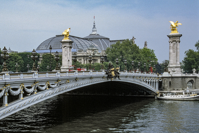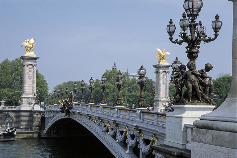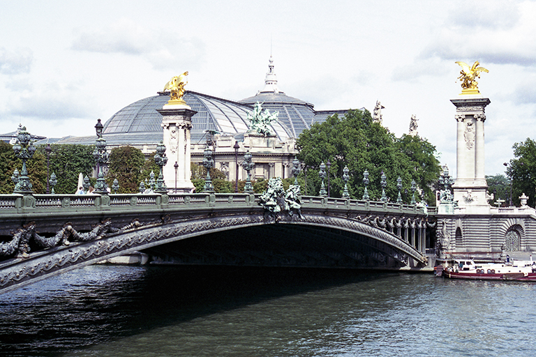 ここからは、私が撮った写真。橋は何度か色が変わり、最近では、灰色→緑がかった茶色→元の色彩と推移した。1枚目の写真は、上流側左岸から撮った “緑がかった茶色の時代” の橋。2枚目の写真は、1枚目とほぼ同じ角度から撮った、元の色彩の橋。この方がよく似合う。背後に写っているのは、グラン・パレの屋根。3枚目の写真は、下流側左岸から、少し離れて撮った全景。4枚目の写真は、橋の装飾が分かるように撮ったもの。