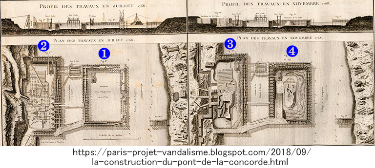 因みに、ペロネのアーチ橋は、半円アーチの上部だけを切り取った扁平なアーチで、ライズ比(高さ/スパン)が、半円なら0.5であるのに対し、サントゥ=マグザンス橋では僅か0.09、コンコルド橋は0.13と、石を並べて作るだけの構造なのに非常に扁平なのが最大の特徴(2019年の日経の記事で、長野県にできた1スパンだけの鋼鉄アーチのライズ比が0.09で日本一扁平と書いてあった)。そして、それまでの橋なら、橋脚の幅はスパンの1/5にするのが通例だったが、コンコルド橋では、最大スパン31mに対し、橋脚の幅は2.9mと、1/10になっている。これは、アーチが扁平なことと相まって、豪雨時の河川の増水の際に橋が流される危険性(九州の石アーチは半円なので、度々流失や破損を被ってきた)を下げる効果がある。どうして、このような構造が可能になったのか? それは、それまでの多連のアーチ橋の設計が、多連でありながら個々のアーチだけで自立するように作られてきた(アーチを崩壊させないように支える「強い推力」を個々の橋脚だけで支持してきた)方式を止め、橋脚には単純に自重だけを受け持たせ、「強い推力」は隣り合ったアーチと橋脚を通して「両岸の橋台」で受け持たせればいい、という発想から生まれたもの。しかし、そのためには、施工中、まだアーチが連続していない段階で、アーチが壊れないようにしなくてはならず、そのためには、次のような手順が採用された(下の図参照)。