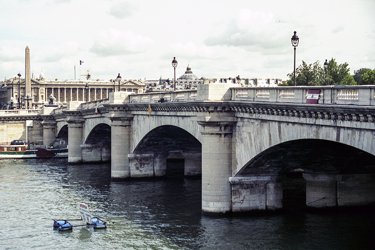 【世界遺産】コンコルド橋(1788~91年)は、18世紀後半のフランスで石アーチ橋の設計概念に革命的な変化をもたらしたジャン=ロドルフ・ペロネ(Jean-Rodolphe Perronet、1708~94年)の代表作。ペロネは、橋梁道路学校(École des ponts et chaussées)の創設者であり初代校長で、橋梁技術(美術を含む)を教える場を作っただけでなく、自ら10以上の橋を架けた。その中で、①パリの中心という場所と、②5スパンで全長155mという規模、③第一次世界大戦で爆発されたサントゥ=マグザンス橋(Pont-Sainte-Maxence、1774~85年、1枚目の写真)に次いで扁平なアーチという点で、コンコルド橋はペロネの最高傑作と言える。